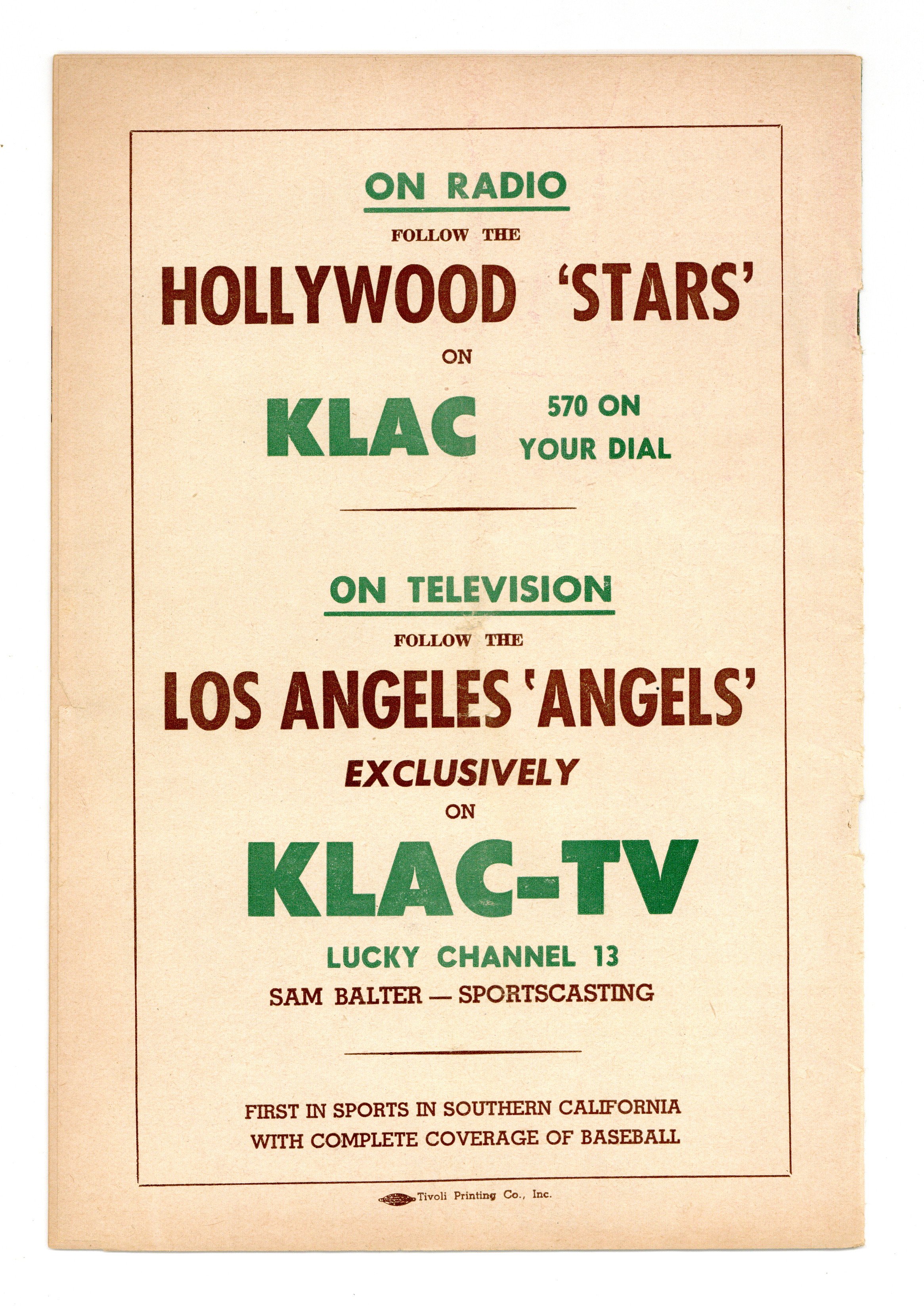 Published 1951 by Hollywood Baseball Club.$15.00- Water damage: Slight. Staple rust: Slight.