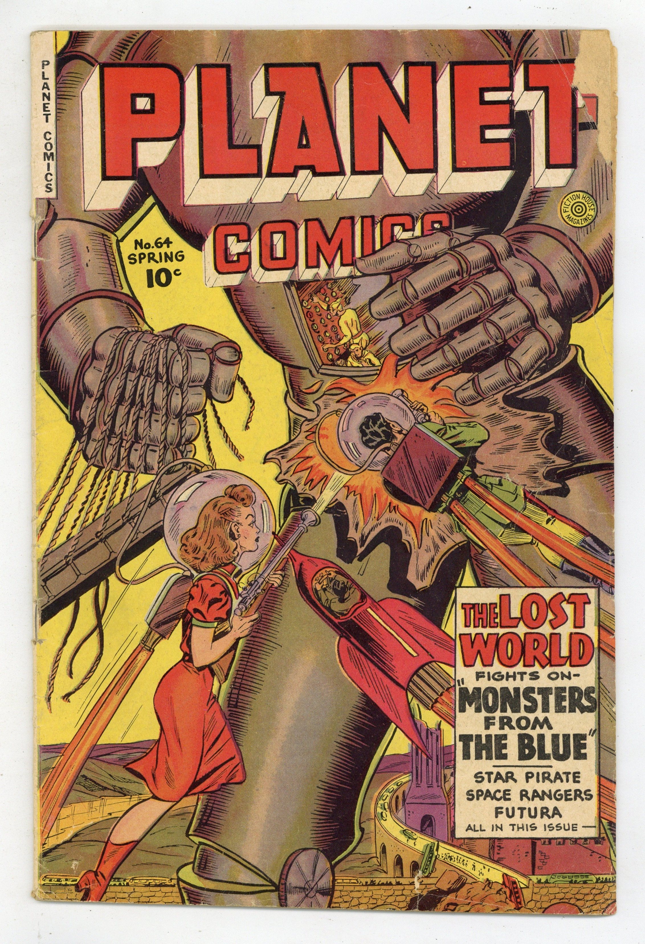 Edited by J. F. Byrne. Stories and art by George Evans, George Roussos, John Rosenberger, and Enrico Bagnoli. The first true science fiction comic, Planet Comics featured classic space opera with square-jawed heroes, rockets, rayguns and bug-eyed aliens of every stripe. In the Lost World, the Volta bring in giant monsters to attack the human resistance on Earth; Life On Other Worlds speculates about what life on Mars might look like; The final adventures of The Star Pirate and Futura. Cool giant robot cover by an unknown artist. The Lost World; Space Rangers; The Star Pirate; The Moon Fell Down; Life On Other Worlds: Mars; Futura. 36 pages, Full Color. Cover price $0.10.