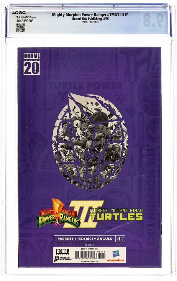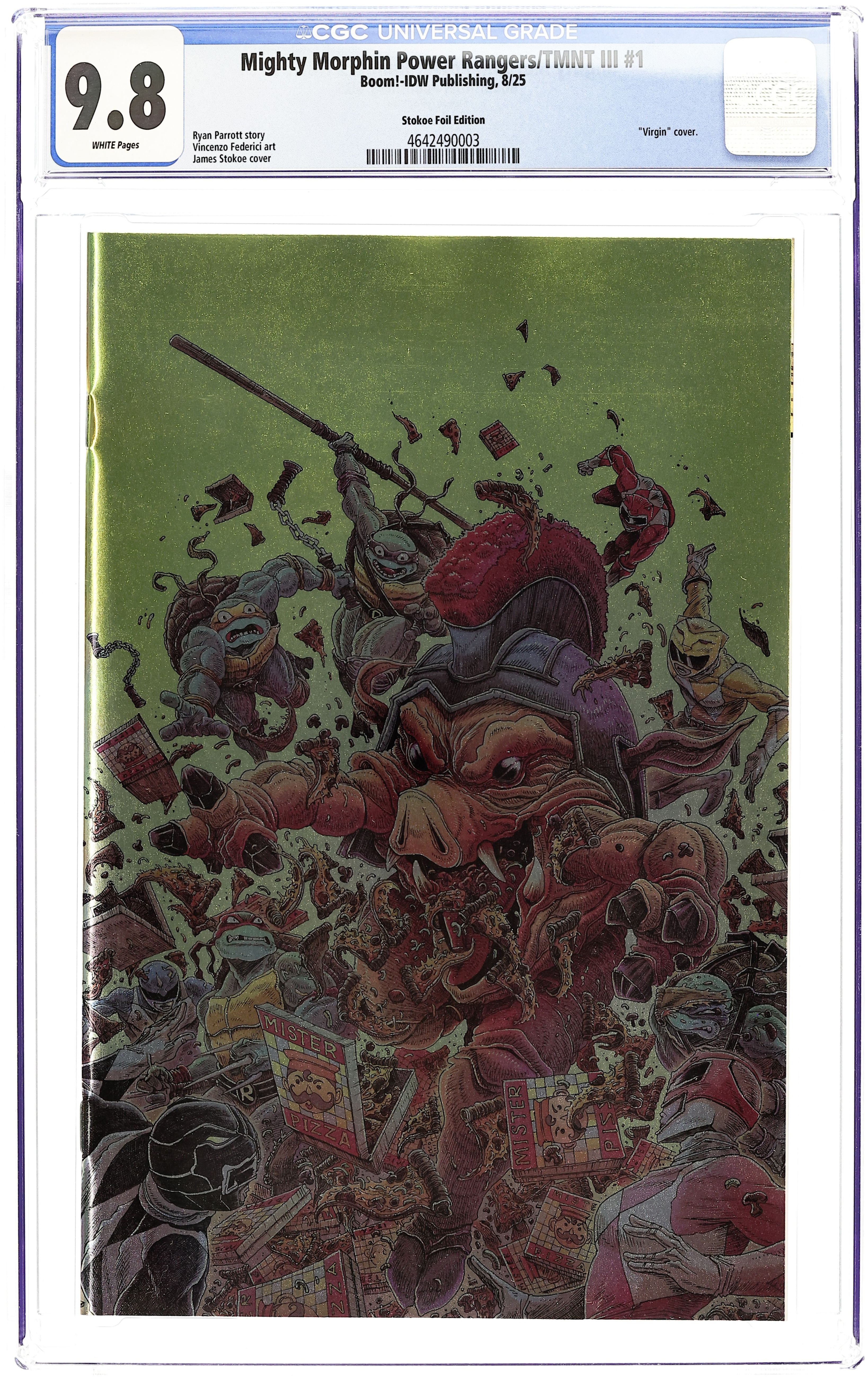Published Aug 2025 by Boom Studios.$24.00Limited 1 for 100 Retailer Incentive Variant Cover. Written by Ryan Parrott. Art by Vicenzo Federici. Cover by James Stokoe. The crossover sensation is back for a third epic adventure! With Rita and Krang defeated, the bad guys arent cutting the Rangers and Turtles no slack! Lord Zedd and Shredder have a new plan to take down the radical teen heroes and if they dont act carefully, they may just succeed. The amazing new series from veteran Mighty Morphin Power Rangers writer Ryan Parrott and Teenage Mutant Ninja Turtles: Mutant Nation artist Vincenzo Federici kicks off with a moment you have to see to believe! 24 pages, full color. Cover price $6.99.