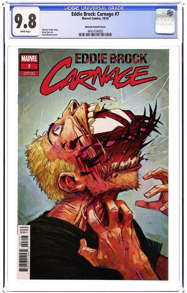 Limited 1 for 25 Retailer Incentive Variant Cover. Written by Charles Soule. Art by Jesus Saiz. Cover by Ivan Shavrin. LIKE AN ITCH YOU JUST CAN'T SCRATCH… Eddie and Carnage need to kill and fast! With Carnage's bloodlust consuming him and his health and willpower slipping, will Eddie be able to hold on to his morals, or will he cross the line he drew and take the life of an undeserving civilian? Or perhaps worthy, perfectly despicable, prey will find them instead? 28 pages, full color. Rated Parental Advisory Cover price $3.99.