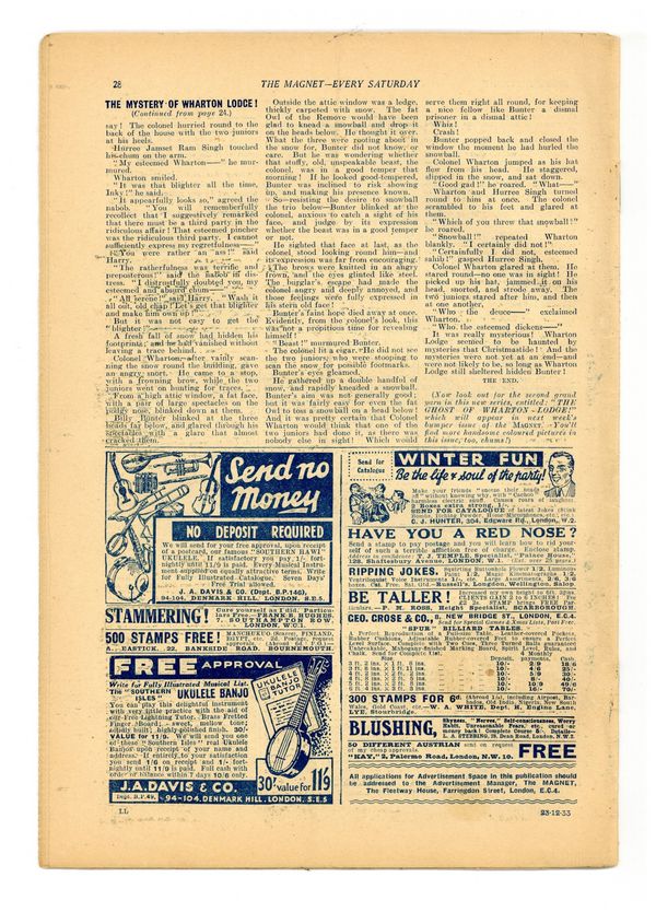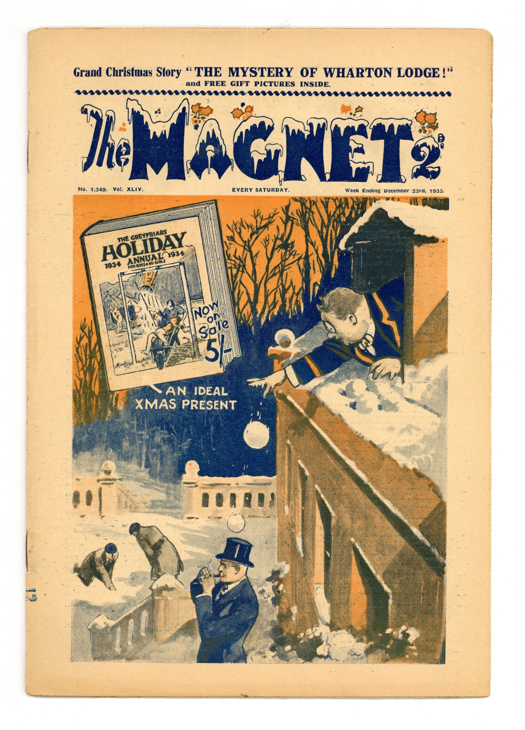 No. 1349 - December 23, 1933. Weekly British publication that ran for nearly 1,700 issues. Featured the anti-hero Billy Bunter of the Greyfriars School, along with serialized shorts. NOTE: This publication contains negative racial and cultural depictions. It reflects some attitudes of the era in which it was published that would not be acceptable today. 7.5" x 11", 28 pages, B&W.