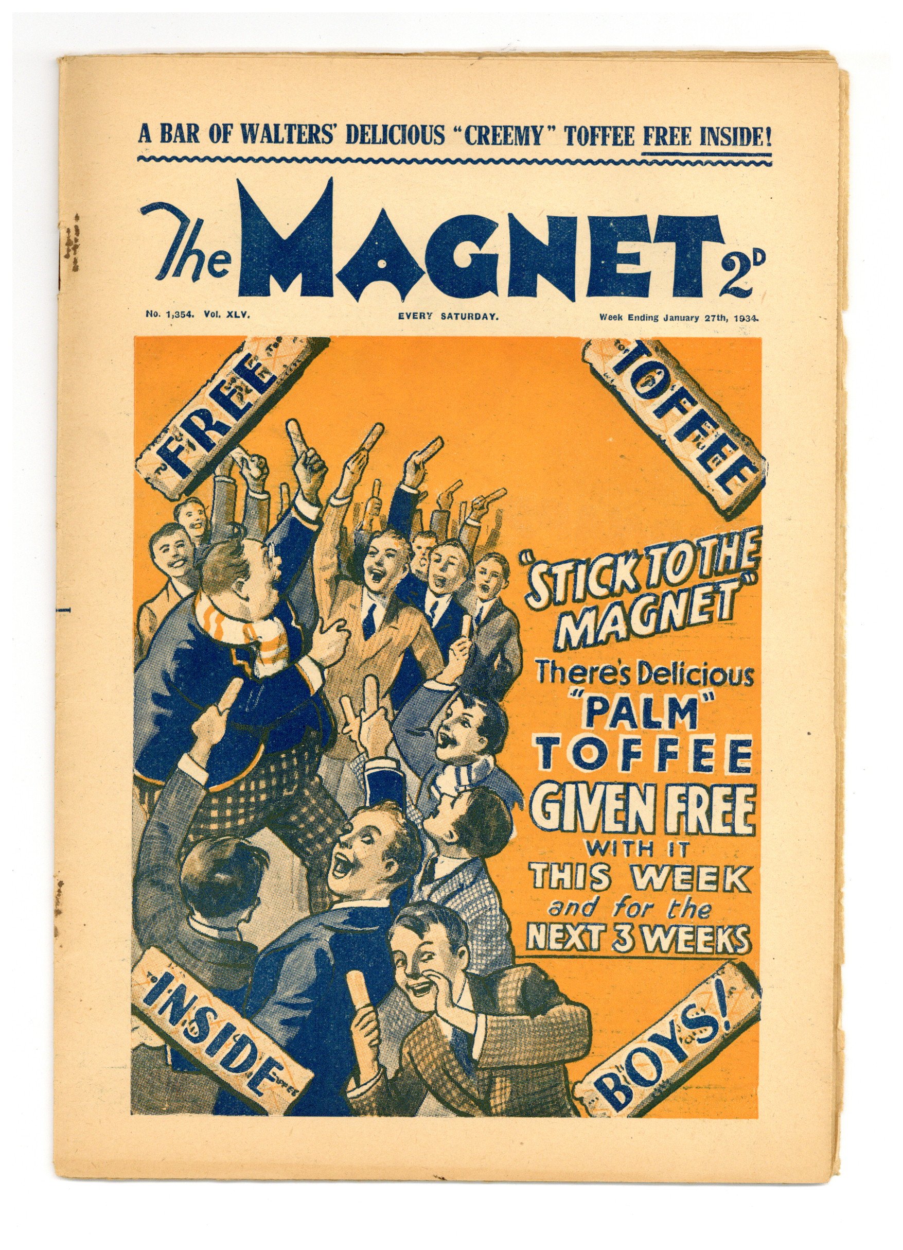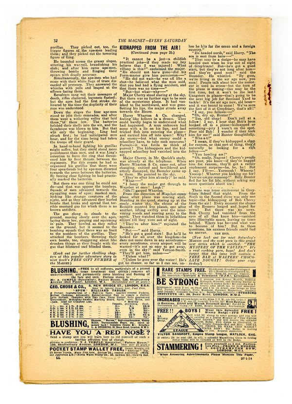 No. 1354 - January 27, 1934. Weekly British publication that ran for nearly 1,700 issues. Featured the anti-hero Billy Bunter of the Greyfriars School, along with serialized shorts. NOTE: This publication contains negative racial and cultural depictions. It reflects some attitudes of the era in which it was published that would not be acceptable today. 7.5" x 11", 28 pages, B&W.