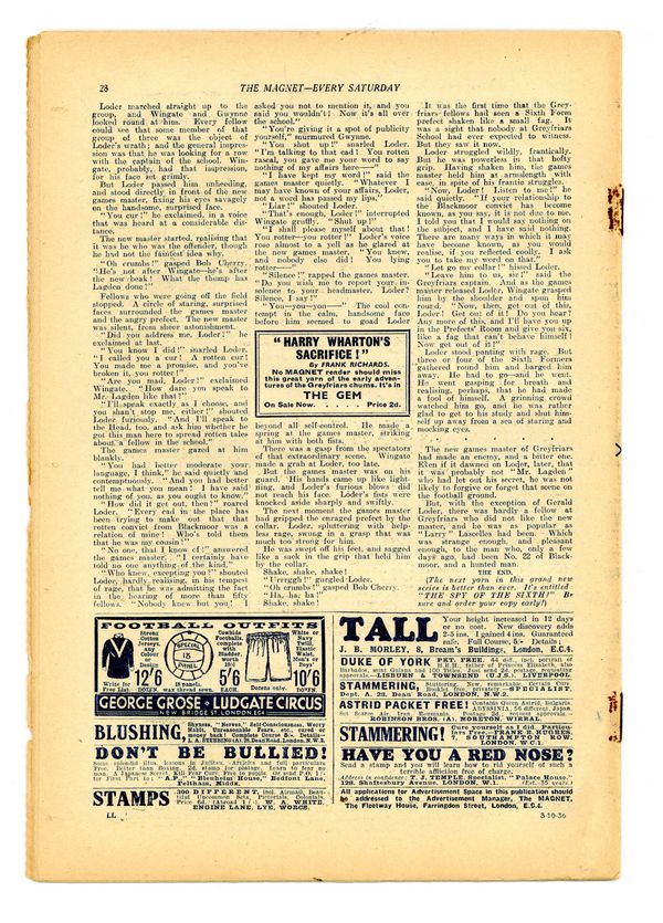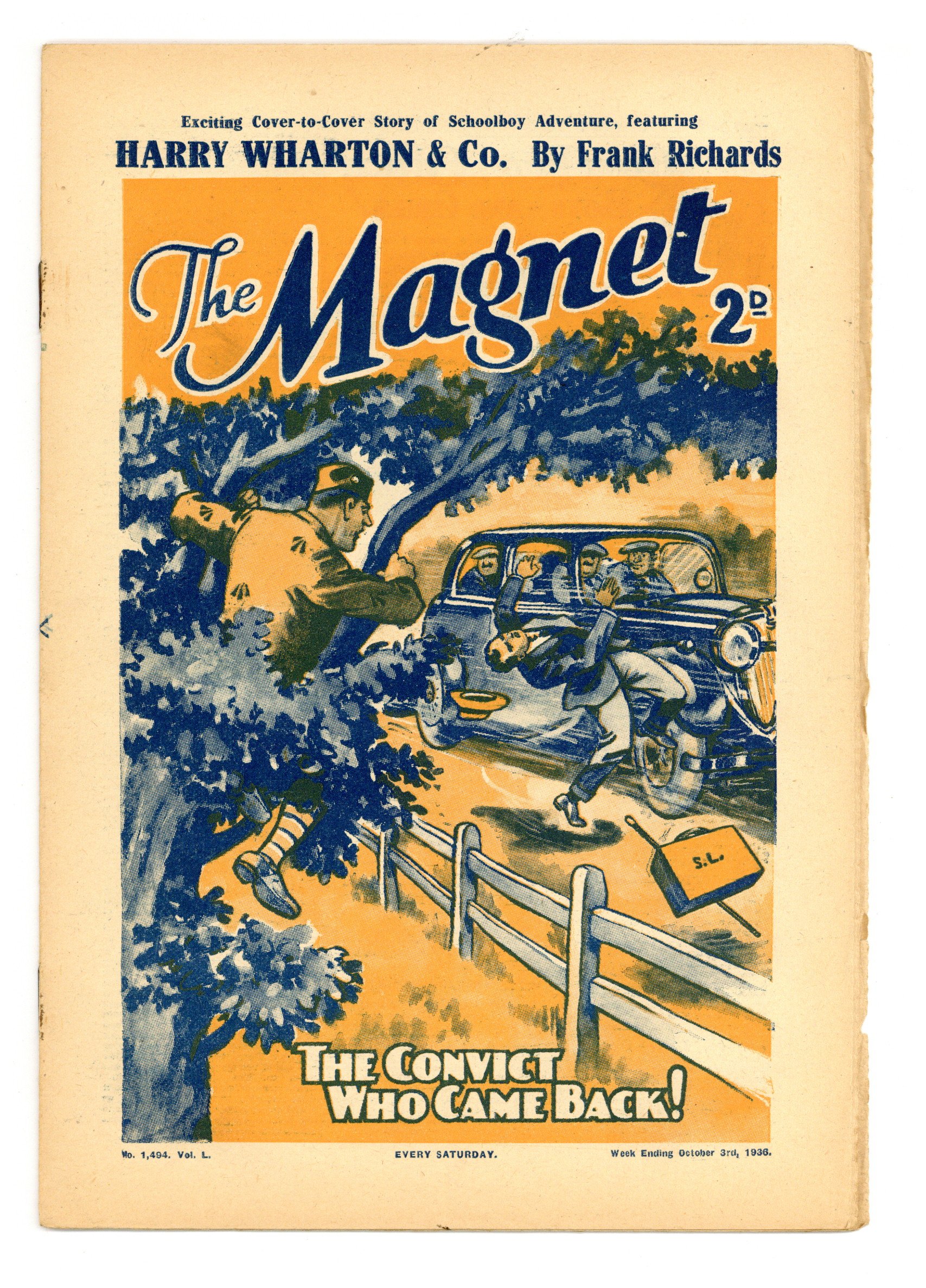No. 1494 - October 03, 1936. Weekly British publication that ran for nearly 1,700 issues. Featured the anti-hero Billy Bunter of the Greyfriars School, along with serialized shorts. NOTE: This publication contains negative racial and cultural depictions. It reflects some attitudes of the era in which it was published that would not be acceptable today. 7.5" x 11", 28 pages, B&W.