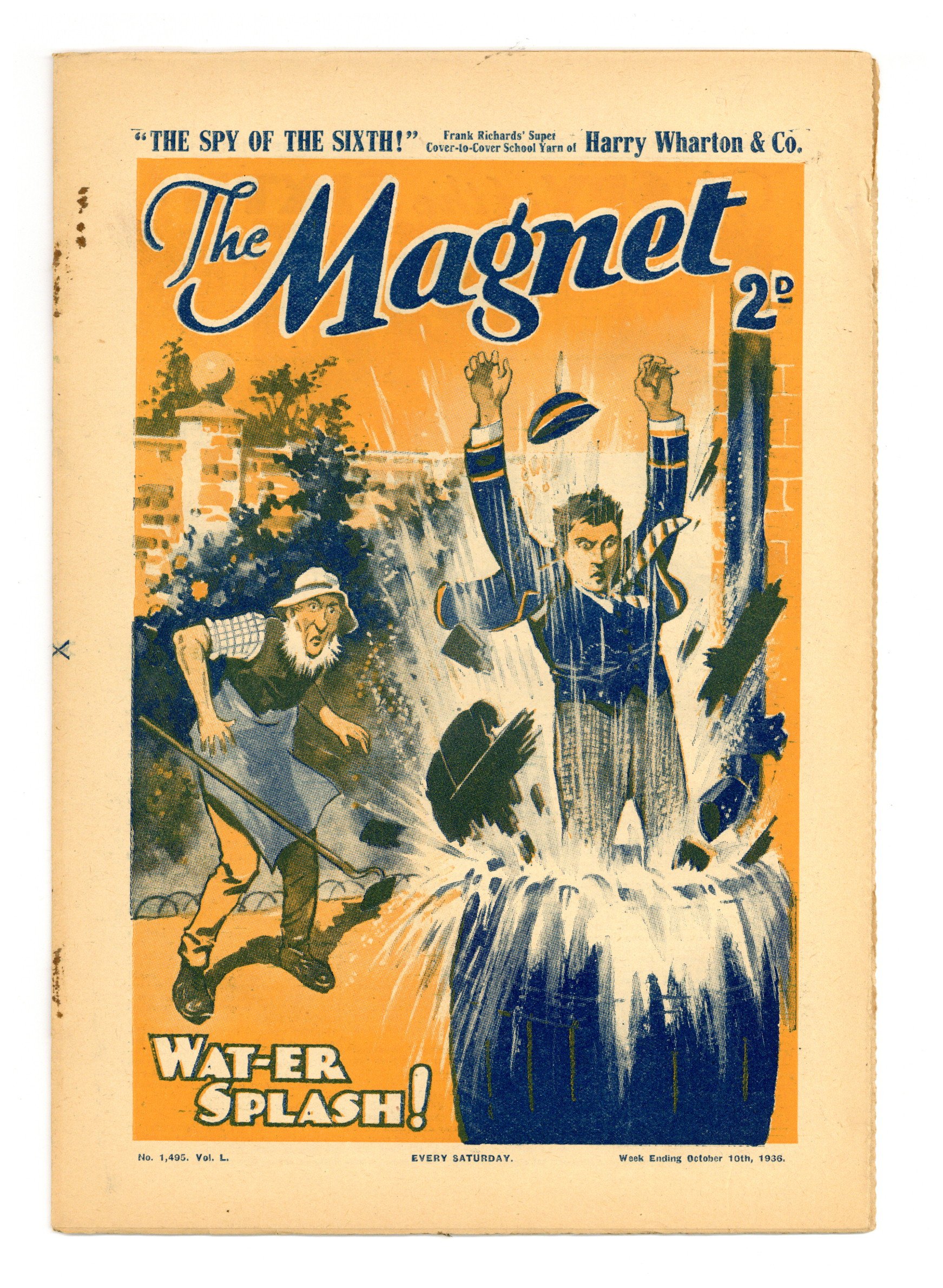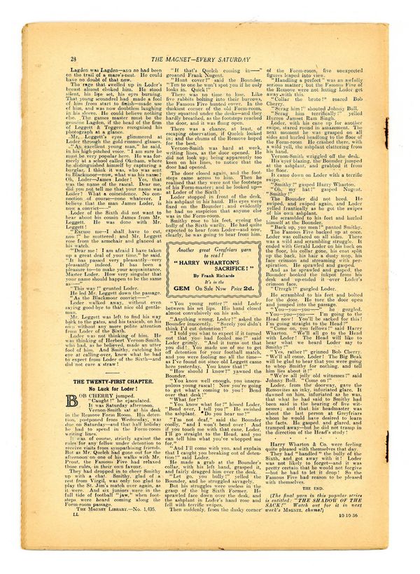 No. 1495 - October 10, 1936. Weekly British publication that ran for nearly 1,700 issues. Featured the anti-hero Billy Bunter of the Greyfriars School, along with serialized shorts. NOTE: This publication contains negative racial and cultural depictions. It reflects some attitudes of the era in which it was published that would not be acceptable today. 7.5" x 11", 28 pages, B&W.