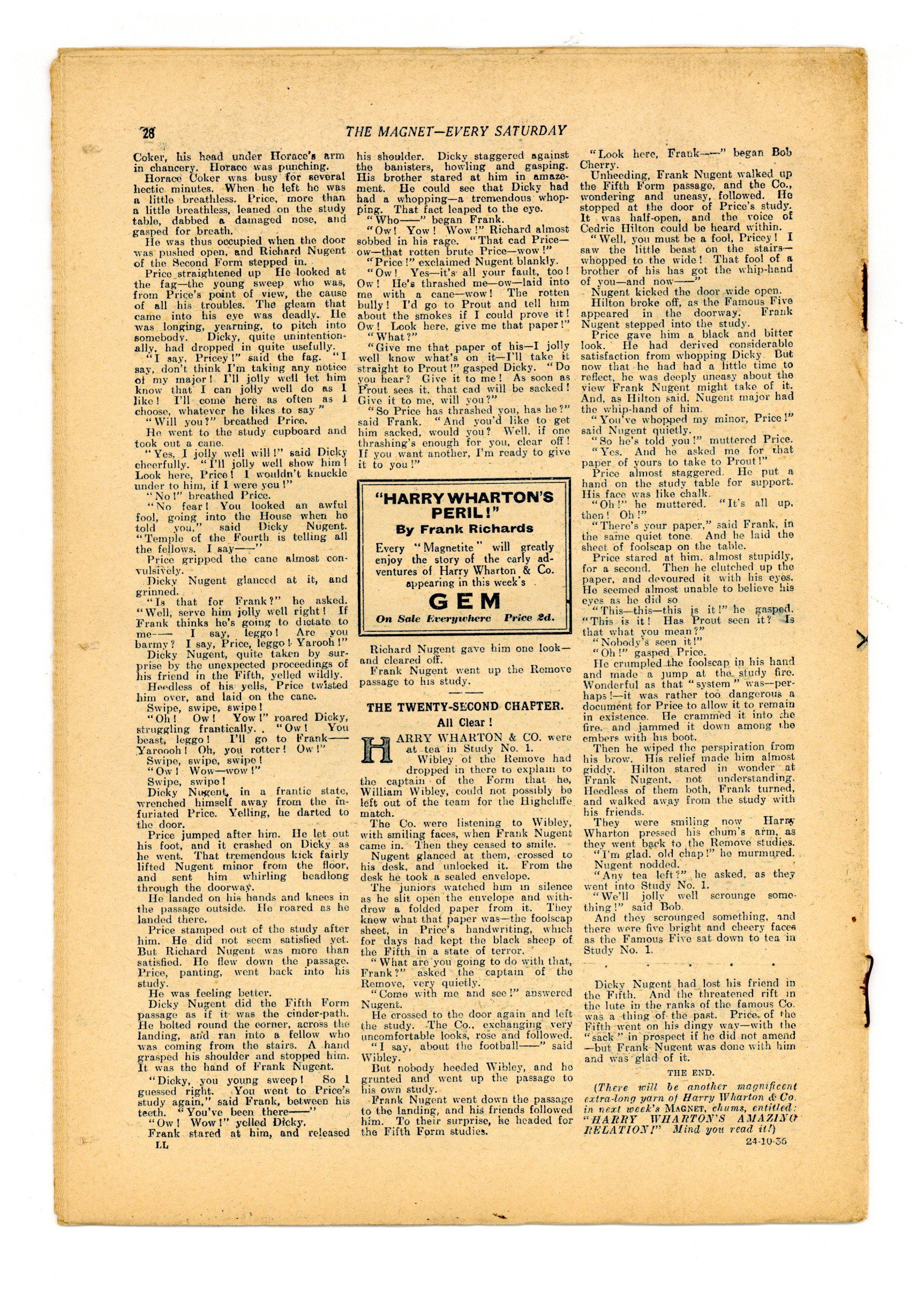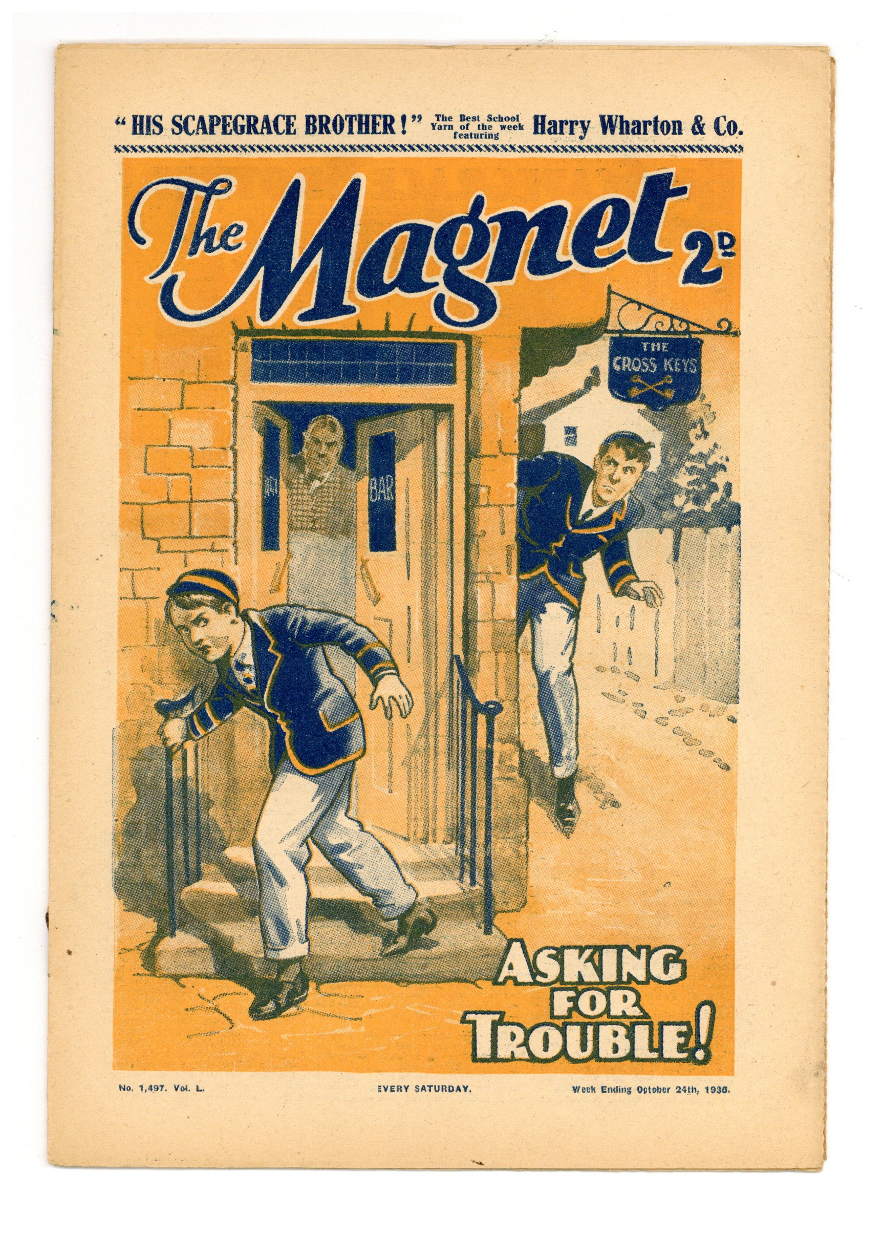 No. 1497 - October 24, 1936. Weekly British publication that ran for nearly 1,700 issues. Featured the anti-hero Billy Bunter of the Greyfriars School, along with serialized shorts. NOTE: This publication contains negative racial and cultural depictions. It reflects some attitudes of the era in which it was published that would not be acceptable today. 7.5" x 11", 28 pages, B&W.