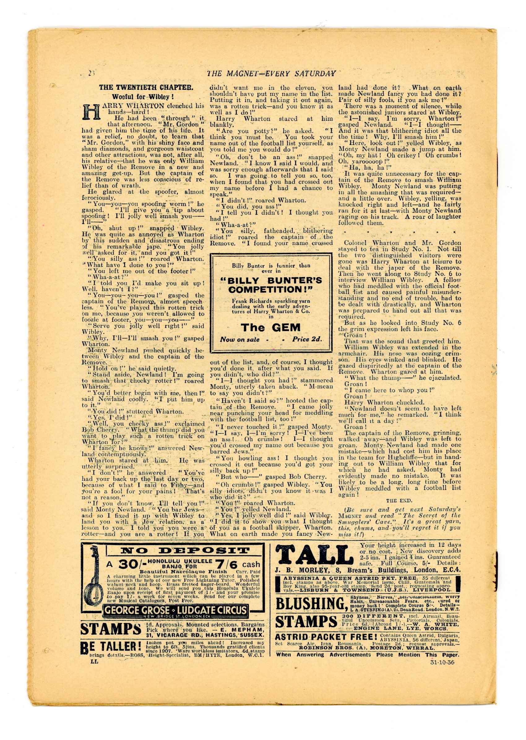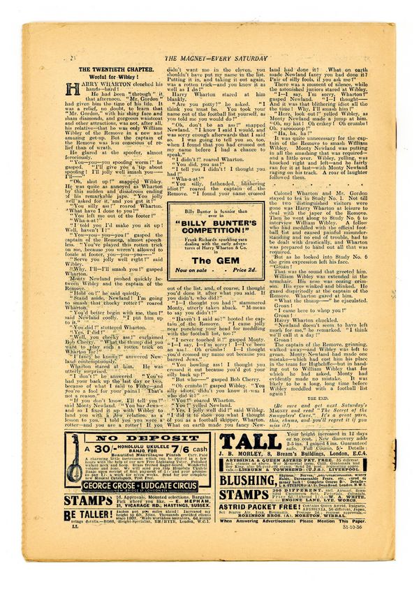 No. 1498 - October 31, 1936. Weekly British publication that ran for nearly 1,700 issues. Featured the anti-hero Billy Bunter of the Greyfriars School, along with serialized shorts. NOTE: This publication contains negative racial and cultural depictions. It reflects some attitudes of the era in which it was published that would not be acceptable today. 7.5" x 11", 28 pages, B&W.