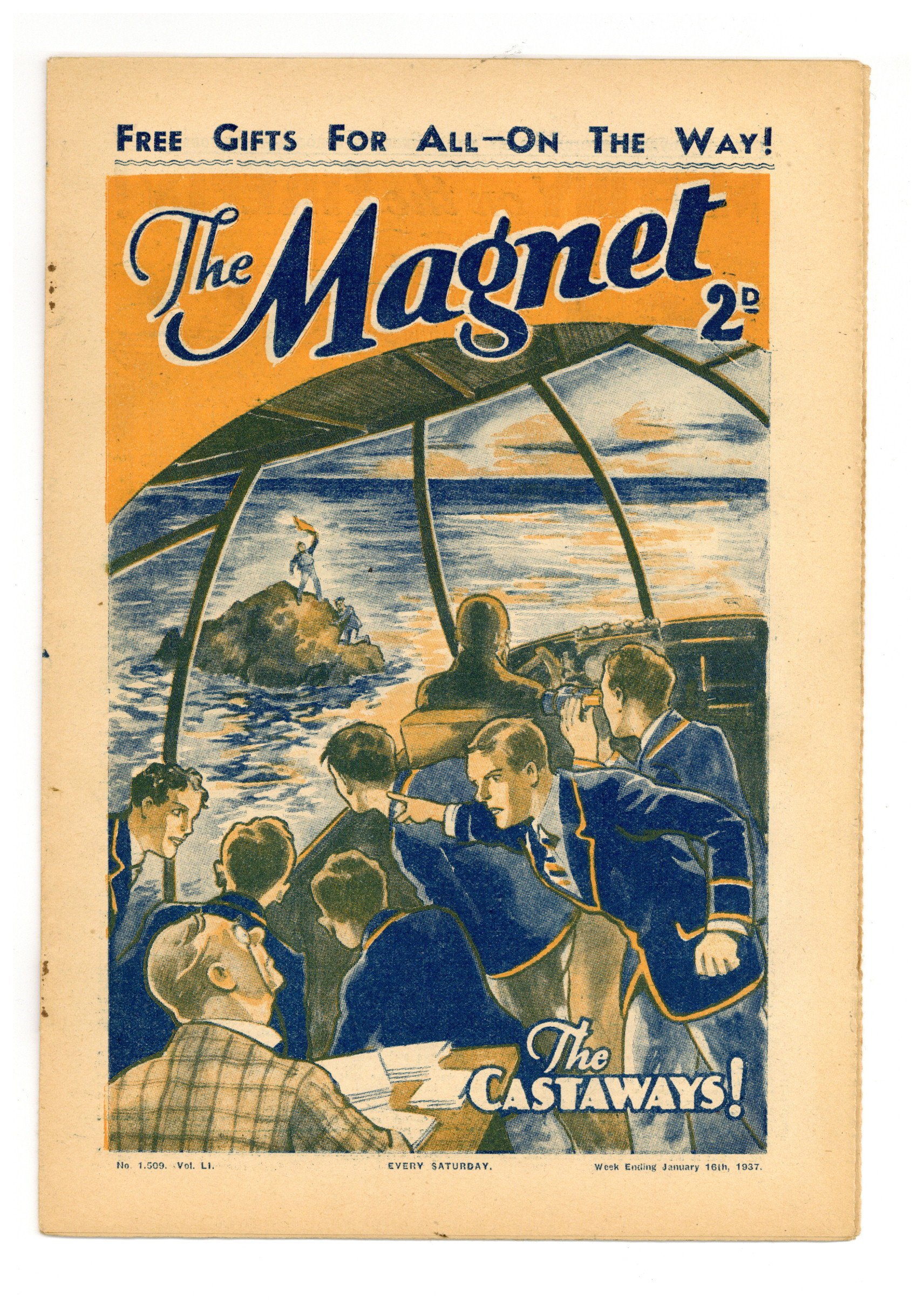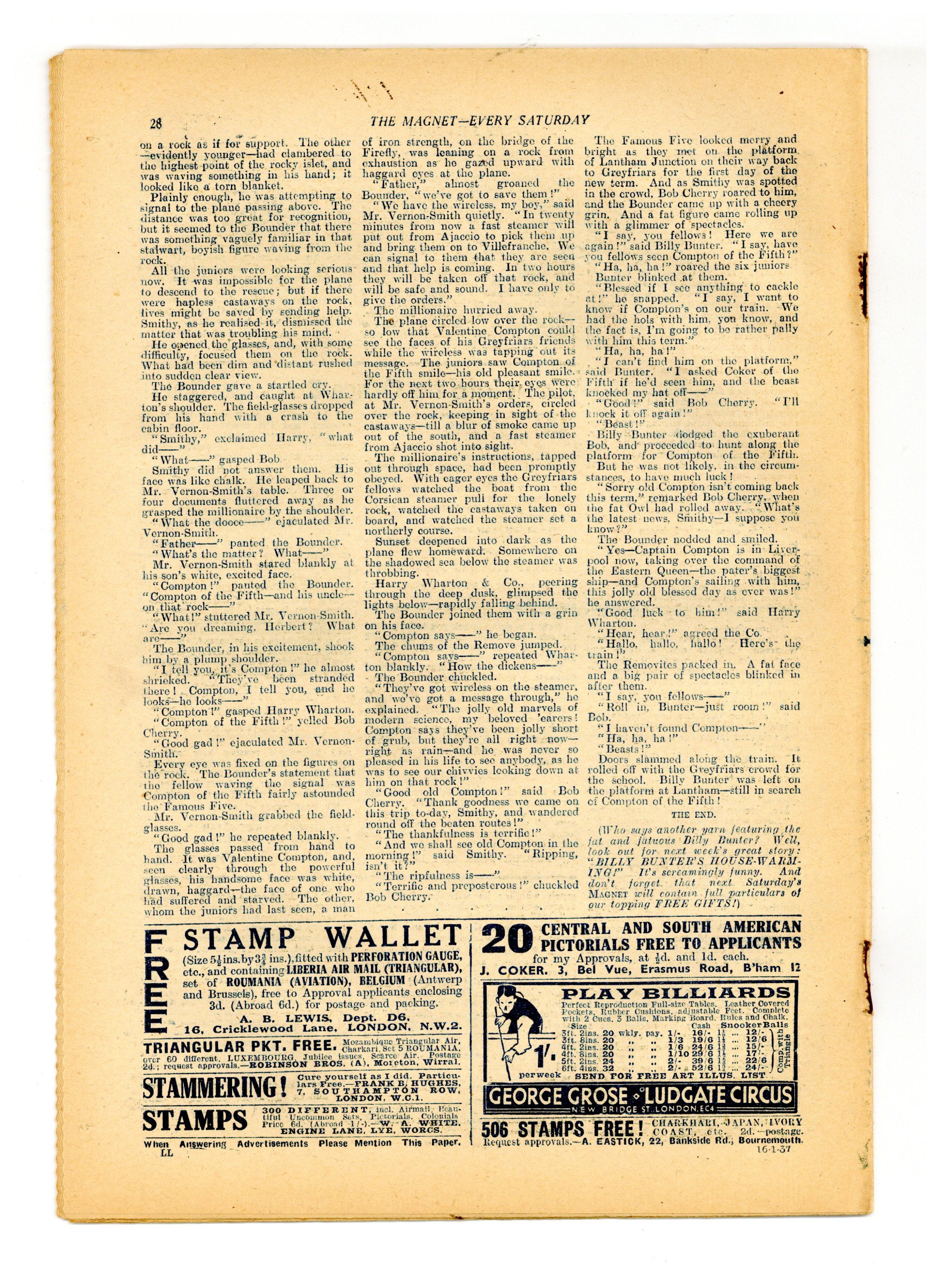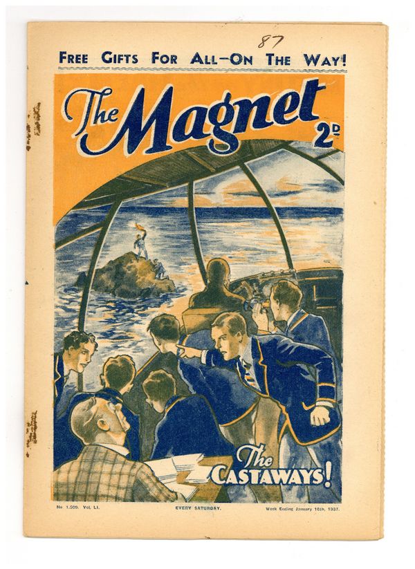 No. 1509 - January 16, 1937. Weekly British publication that ran for nearly 1,700 issues. Featured the anti-hero Billy Bunter of the Greyfriars School, along with serialized shorts. NOTE: This publication contains negative racial and cultural depictions. It reflects some attitudes of the era in which it was published that would not be acceptable today. 7.5" x 11", 28 pages, B&W.