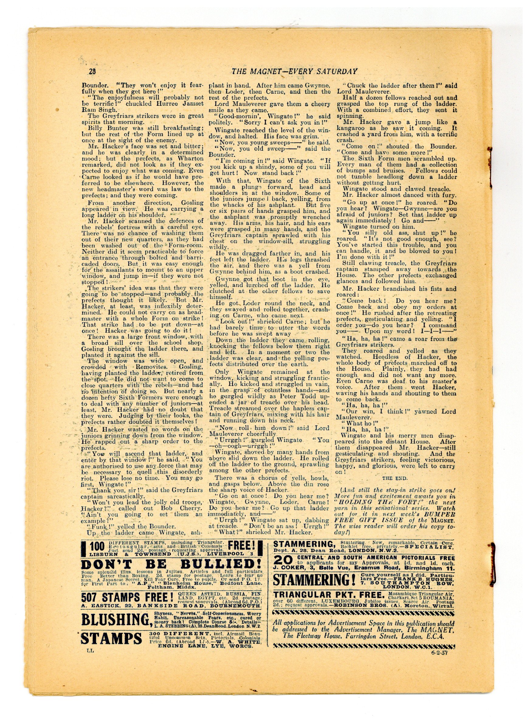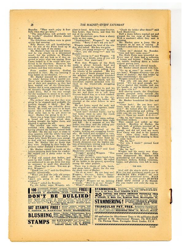 No. 1512 - February 06, 1937. Weekly British publication that ran for nearly 1,700 issues. Featured the anti-hero Billy Bunter of the Greyfriars School, along with serialized shorts. NOTE: This publication contains negative racial and cultural depictions. It reflects some attitudes of the era in which it was published that would not be acceptable today. 7.5" x 11", 28 pages, B&W.