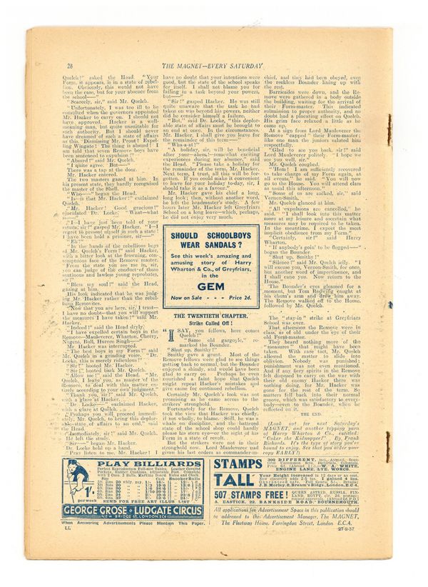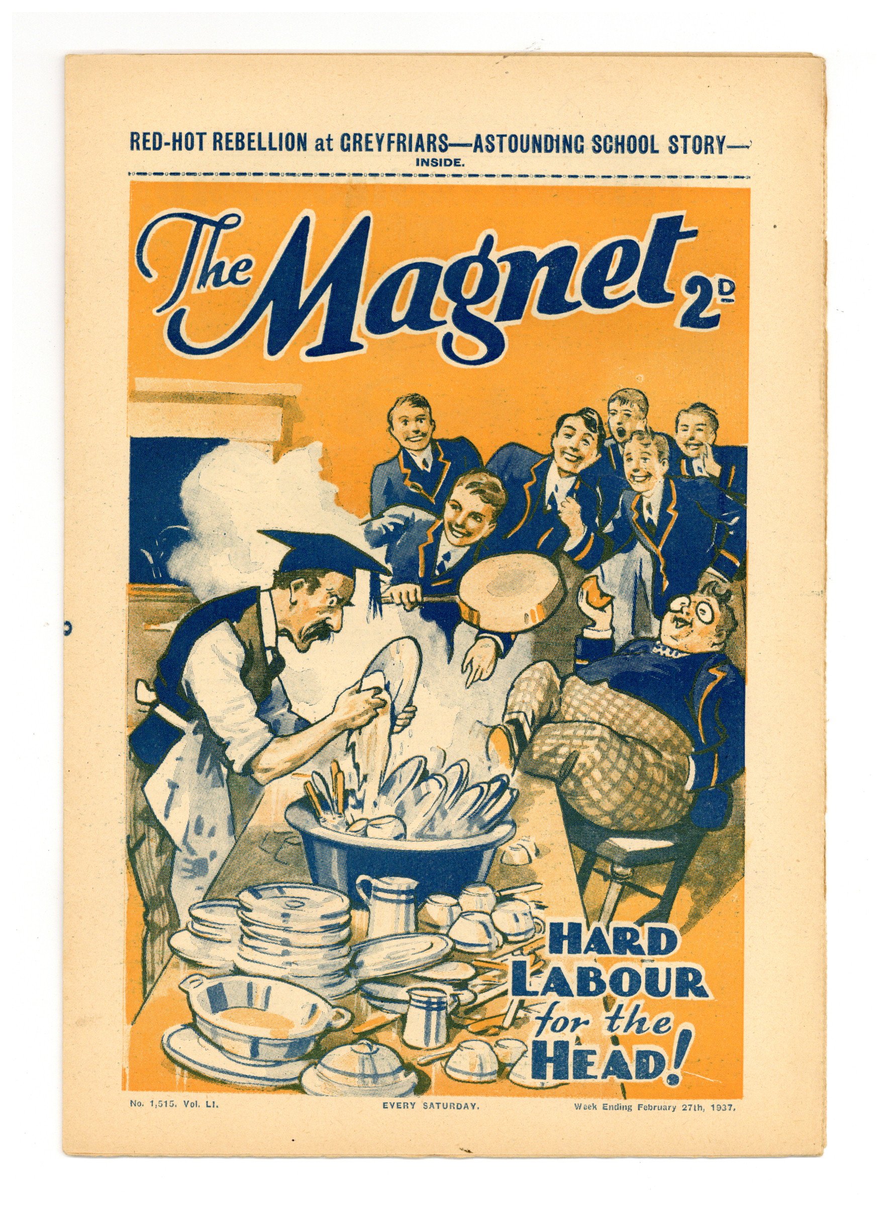 No. 1515 - February 27, 1937. Weekly British publication that ran for nearly 1,700 issues. Featured the anti-hero Billy Bunter of the Greyfriars School, along with serialized shorts. NOTE: This publication contains negative racial and cultural depictions. It reflects some attitudes of the era in which it was published that would not be acceptable today. 7.5" x 11", 28 pages, B&W.