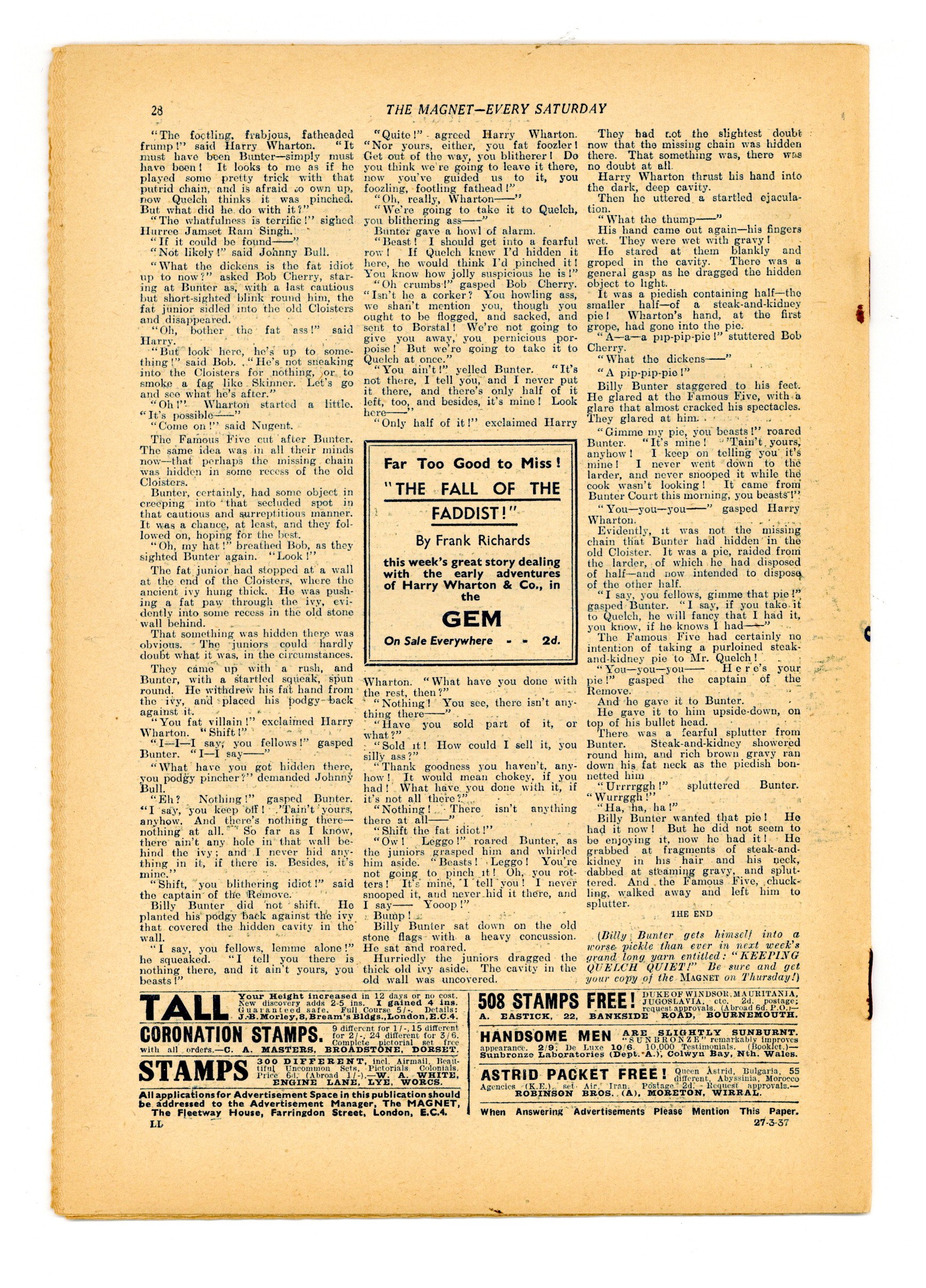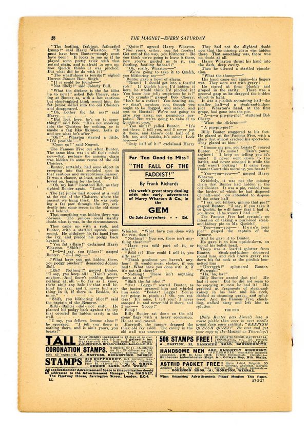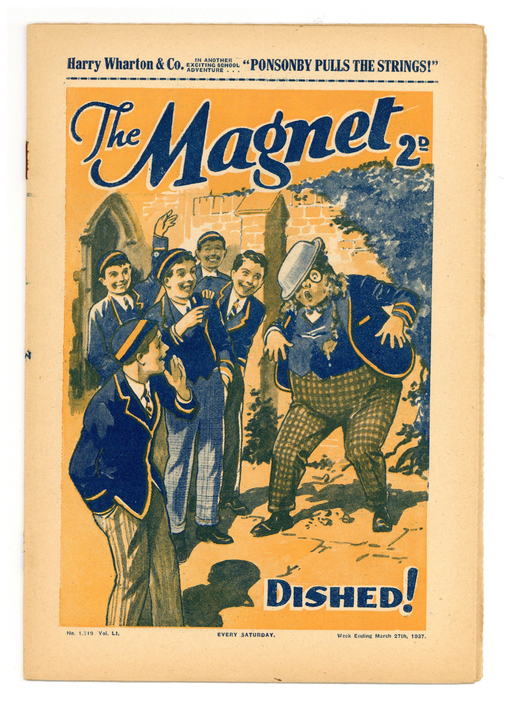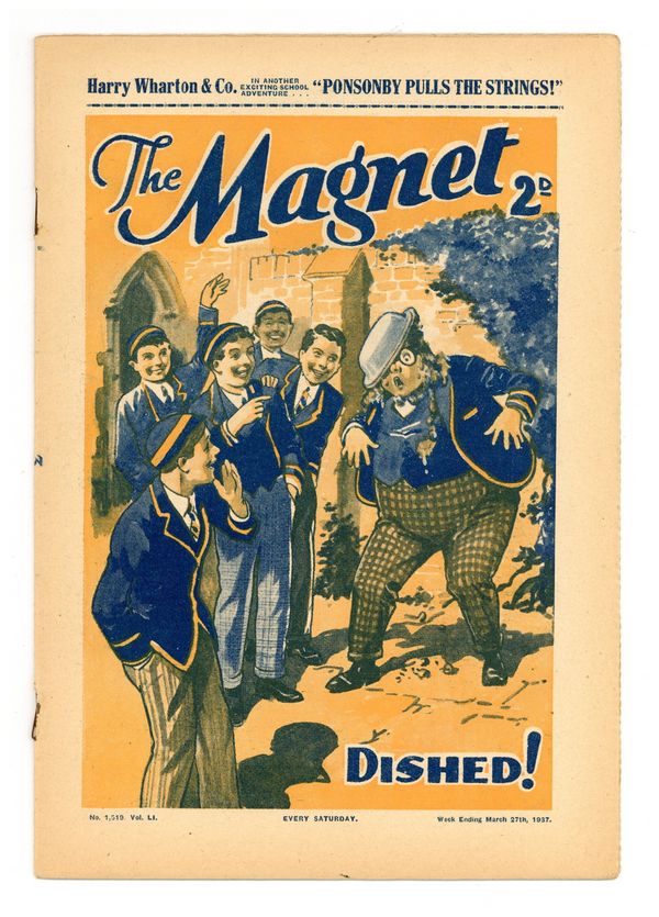 No. 1519 - March 27, 1937. Weekly British publication that ran for nearly 1,700 issues. Featured the anti-hero Billy Bunter of the Greyfriars School, along with serialized shorts. NOTE: This publication contains negative racial and cultural depictions. It reflects some attitudes of the era in which it was published that would not be acceptable today. 7.5" x 11", 28 pages, B&W.