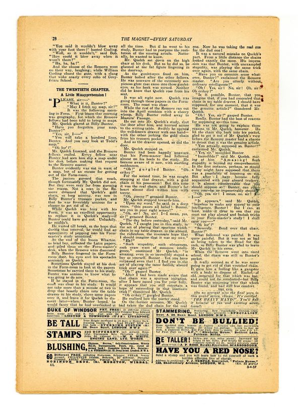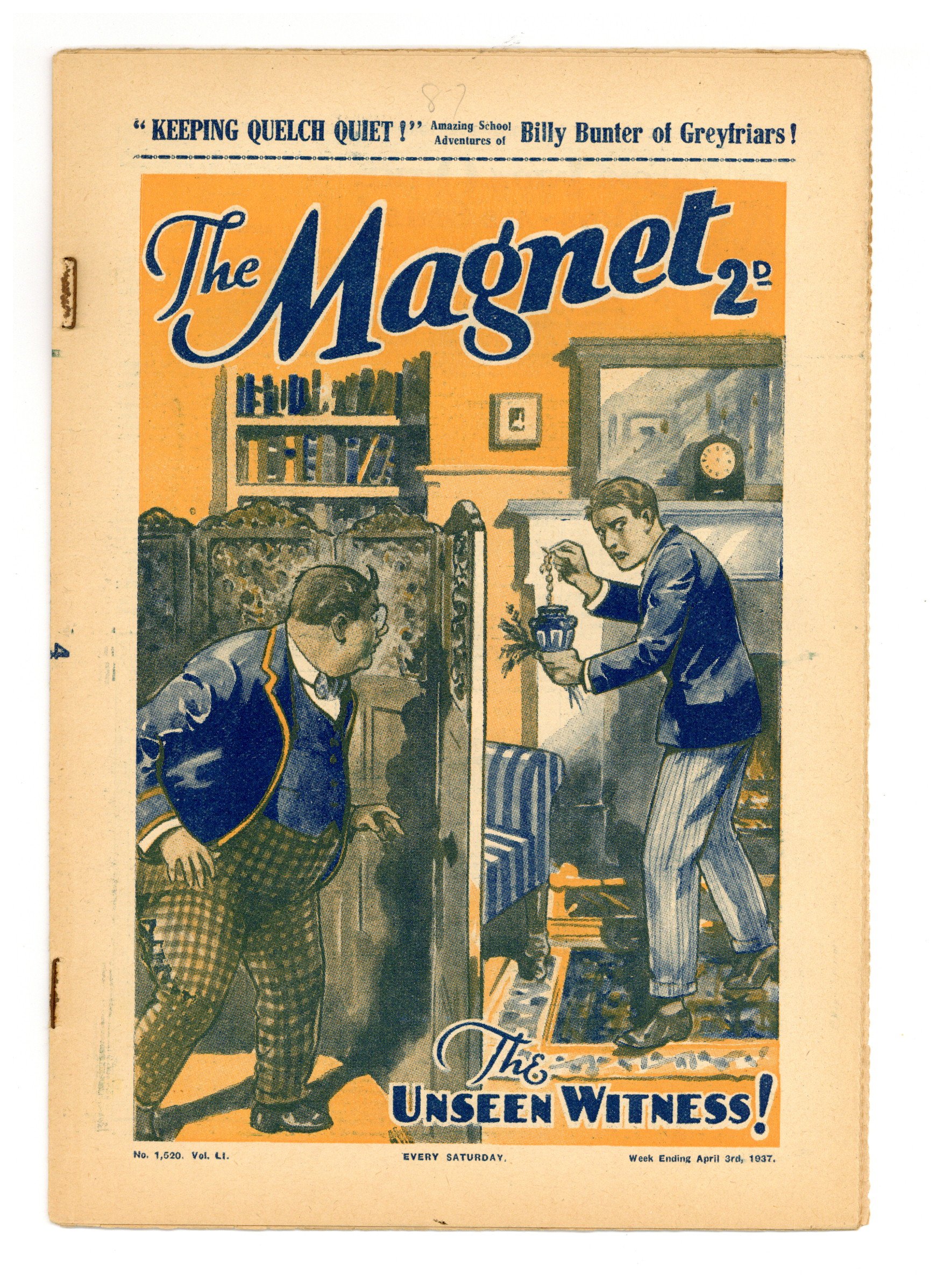 No. 1520 - April 03, 1937. Weekly British publication that ran for nearly 1,700 issues. Featured the anti-hero Billy Bunter of the Greyfriars School, along with serialized shorts. NOTE: This publication contains negative racial and cultural depictions. It reflects some attitudes of the era in which it was published that would not be acceptable today. 7.5" x 11", 28 pages, B&W.