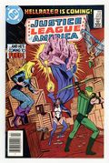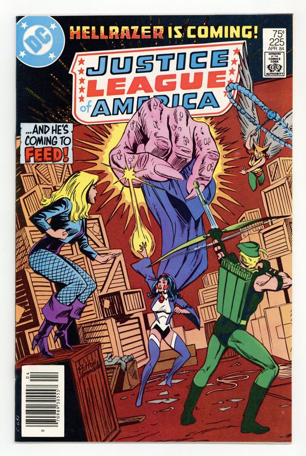 Newsstand Edition. Written by Joey Cavalieri, with Art by Chuck Patton and Pablo Marcos. Cover by Chuck Patton and Sal Amendola. "Let There Be Light" - Part 1 of 3. Hellrazer is coming...and he's coming to feed! Characters: Atom [Ray Palmer]; Black Canary; Green Arrow [Earth-1]; Hawkwoman [Shayera Thal] (as Hawkgirl); Hawkman [Katar Hol]; Zatanna (all as the Justice League of America/JLA); Lord Gravesend (villain); Hellrazer (villain). Cover price $0.75.