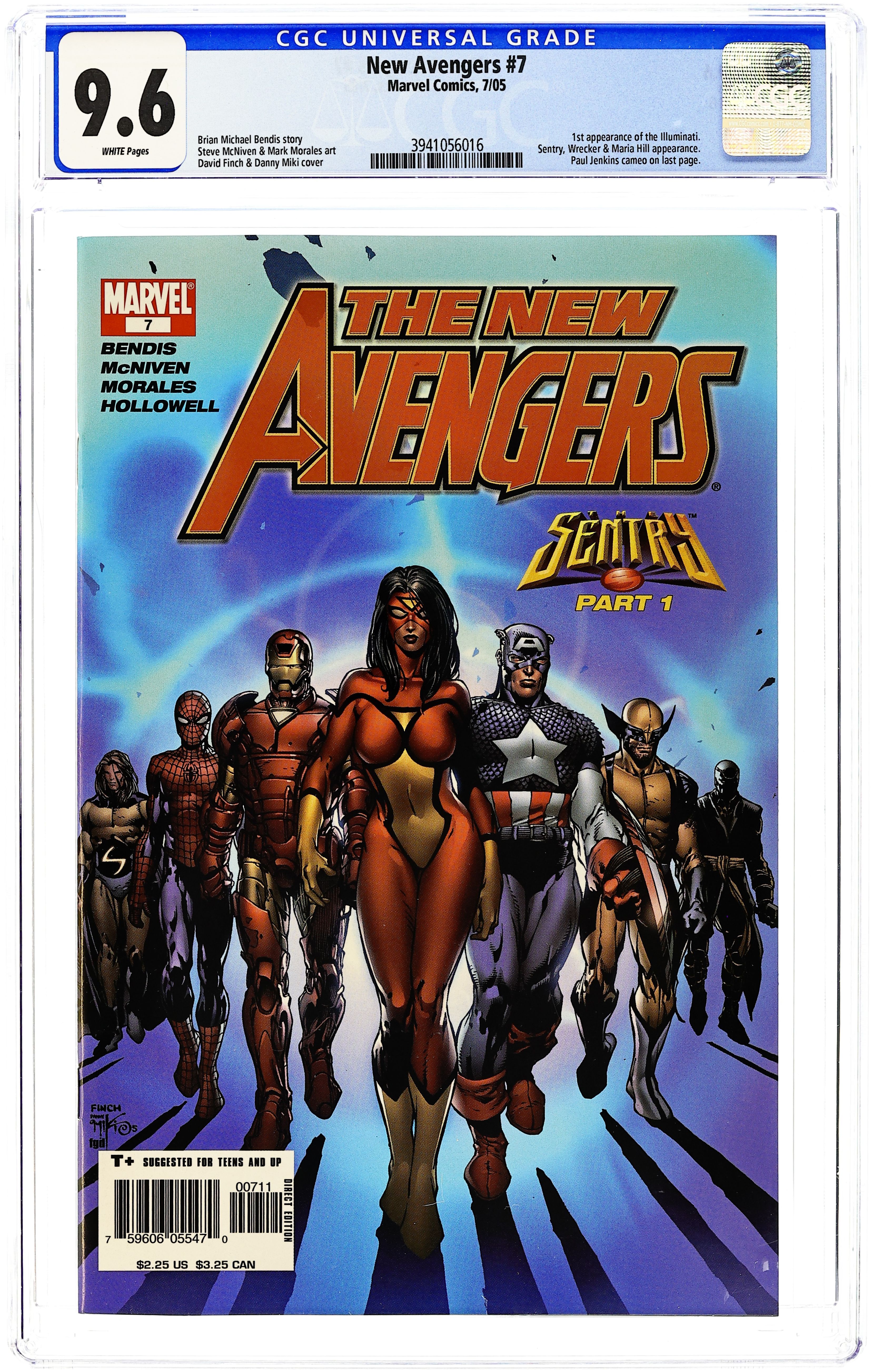 The Sentry: Part 1 of 3 - Written by BRIAN MICHAEL BENDIS Penciled by STEVE MCNIVEN Cover by DAVID FINCH. David Finch takes a well-deserved nappy time to give Young Gun guest artist Steve McNiven a moment to shine. The mysteries and tragedies of the Sentry come to the forefront as the New Avengers come to his aid. Who is behind the Sentry's tragic life? The answer WILL SHOCK YOU! 32 PGS./Marvel PSR NOTE: 1st appearance of the Illuminati (a secret group comprised of Iron Man, Mister Fantasic, Namor, Professor X, Doctor Strange, and Black Bolt). Cover price $2.25.