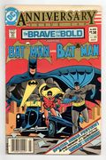 $44.00Newsstand Edition. 64-page giant. Cover by Jim Aparo. Final issue of the series-1st Appearance of Katana, 1st appearance of Geo-Force, and 1st appearance of Halo. The Golden Age Batman stars in "Smell of Brimstone, Stench of Death!", script by Mike Barr, pencils by Dave Gibbons, inks by Dave Gibbons (1-3, 20-40) and Gary Martin (4-19); The story explains how 2 different personas for Brimstone exist: Both aware somehow of each others' existences on a spiritual level; In 1955, on Earth-2, Brimstone's defeated by Batman and sent to prison, but later transfers his 'spiritual' essence to his doppelganger on Earth-1 in 1983 to restart his criminal empire; He learns of a Batman on this world, but is also defeated here by him; When his essence returns to its own body, it is a vegetable by this time, trapping him there for the rest of his natural life, while his 'good' Earth-1 counterpart is unaware of what happened. The contemporary Batman stars in "Hell on Earth!", script by Barr, art by Gibbons. Back-up story: 1st appearance of Batman and the Outsiders in a 16-page sneak preview, script by Barr, art by Jim Aparo. One-page Bat-Mite strip by Stephen DeStefano. 68 Pages, Full Color. Cover price $1.50.