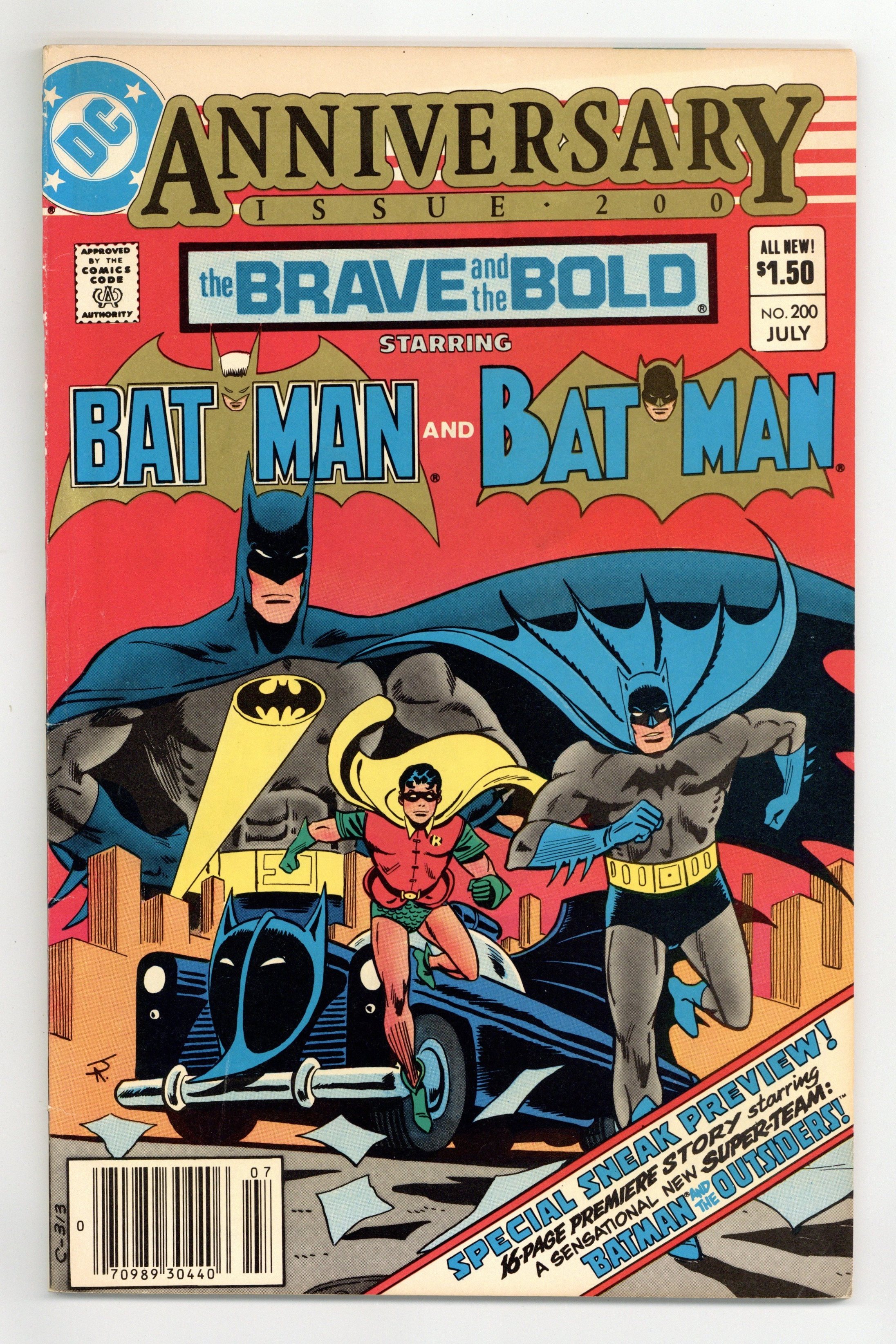 Newsstand Edition. 64-page giant. Cover by Jim Aparo. Final issue of the series-1st Appearance of Katana, 1st appearance of Geo-Force, and 1st appearance of Halo. The Golden Age Batman stars in "Smell of Brimstone, Stench of Death!", script by Mike Barr, pencils by Dave Gibbons, inks by Dave Gibbons (1-3, 20-40) and Gary Martin (4-19); The story explains how 2 different personas for Brimstone exist: Both aware somehow of each others' existences on a spiritual level; In 1955, on Earth-2, Brimstone's defeated by Batman and sent to prison, but later transfers his 'spiritual' essence to his doppelganger on Earth-1 in 1983 to restart his criminal empire; He learns of a Batman on this world, but is also defeated here by him; When his essence returns to its own body, it is a vegetable by this time, trapping him there for the rest of his natural life, while his 'good' Earth-1 counterpart is unaware of what happened. The contemporary Batman stars in "Hell on Earth!", script by Barr, art by Gibbons. Back-up story: 1st appearance of Batman and the Outsiders in a 16-page sneak preview, script by Barr, art by Jim Aparo. One-page Bat-Mite strip by Stephen DeStefano. 68 Pages, Full Color. Cover price $1.50.