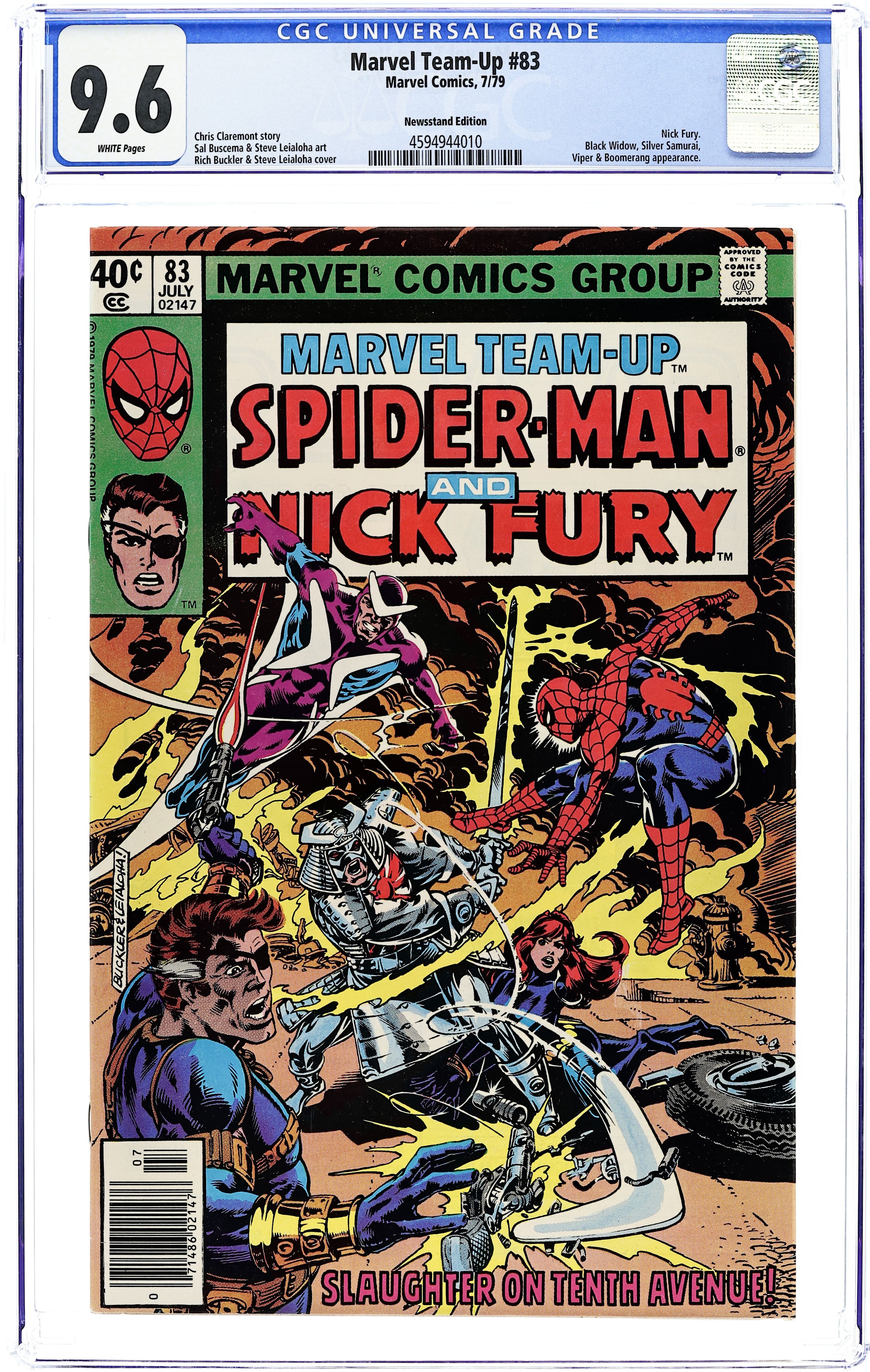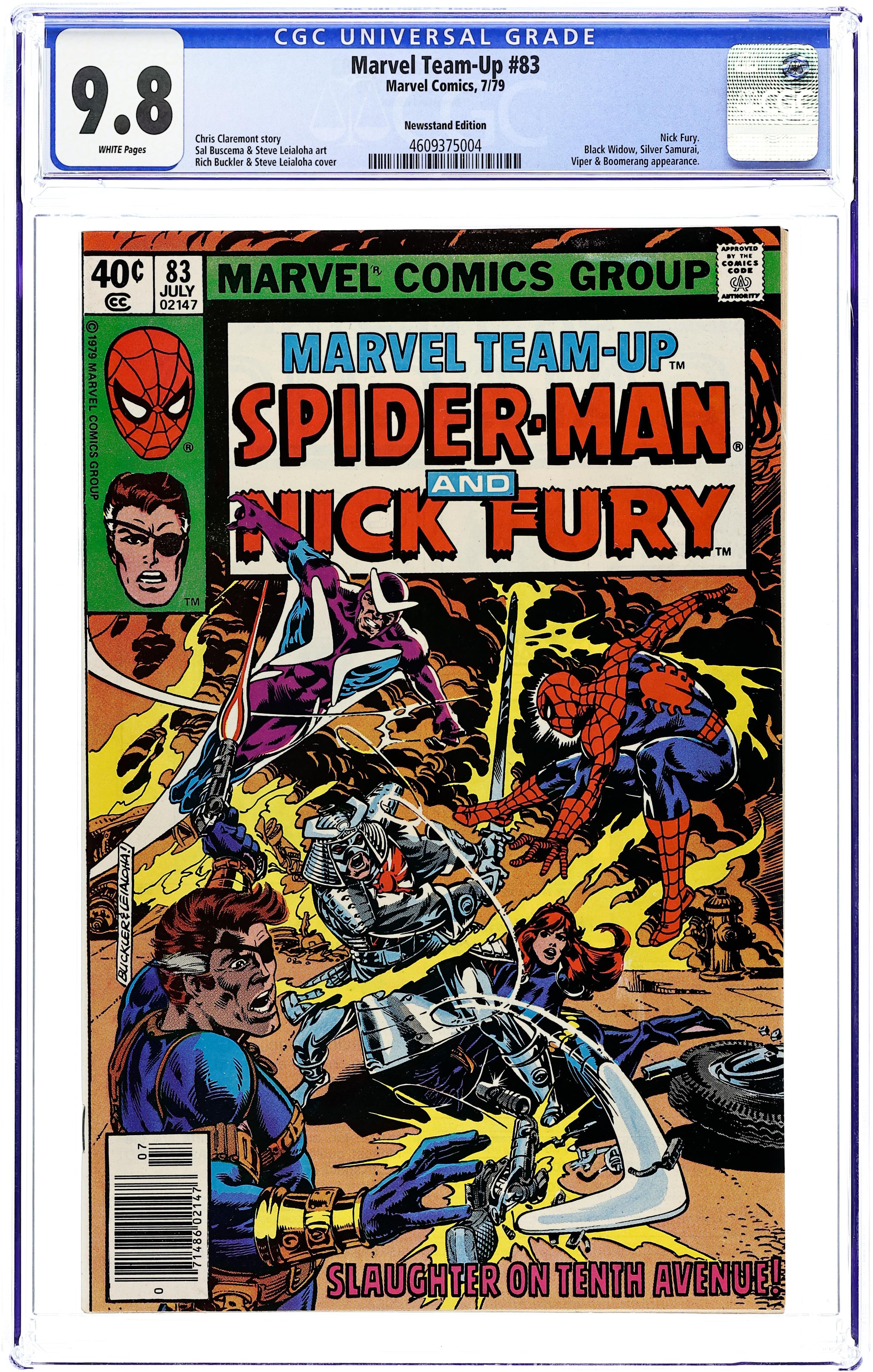 Newsstand Edition. "Slaughter on 10th Avenue!" Part 2 of 4. Guest-starring Spider-Man, Nick Fury, and the Black Widow. Script by Chris Claremont. Art by Sal Buscema (breakdowns) and Steve Leialoha (finishes). Cover by Rich Buckler and Steve Leialoha. In stunning fashion, the web-slinger and the widow have gone down to defeat at the hands of SHIELD and its director, Nick Fury! Now the Black Widow is a prisoner of SHIELD, and a dazed Spider-Man is trying to figure out what is going on. When Natasha escapes from the SHIELD facility, she turns to her only friend left in Manhattan...Peter Parker! At his Chelsea apartment, Aunt May's nephew is consoling Natasha, when all of a sudden Nick Fury kicks in the door! Minutes later Boomerang attacks! And then the Silver Samurai! It's a wild free-for-all in the streets with the wall-crawler and the Black Widow caught in the middle! Cameo appearances by Clay Quartermain, Jasper Sitwell and the Viper. 36 pages. Cover price $0.40.