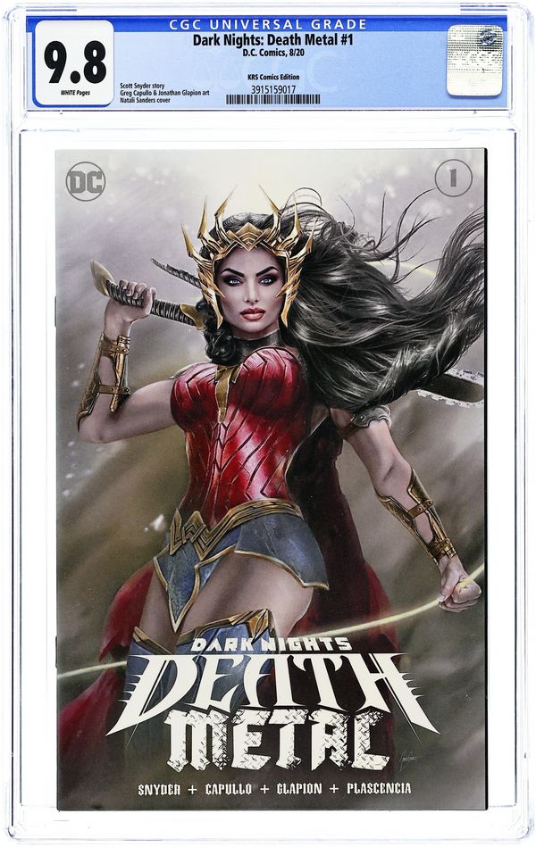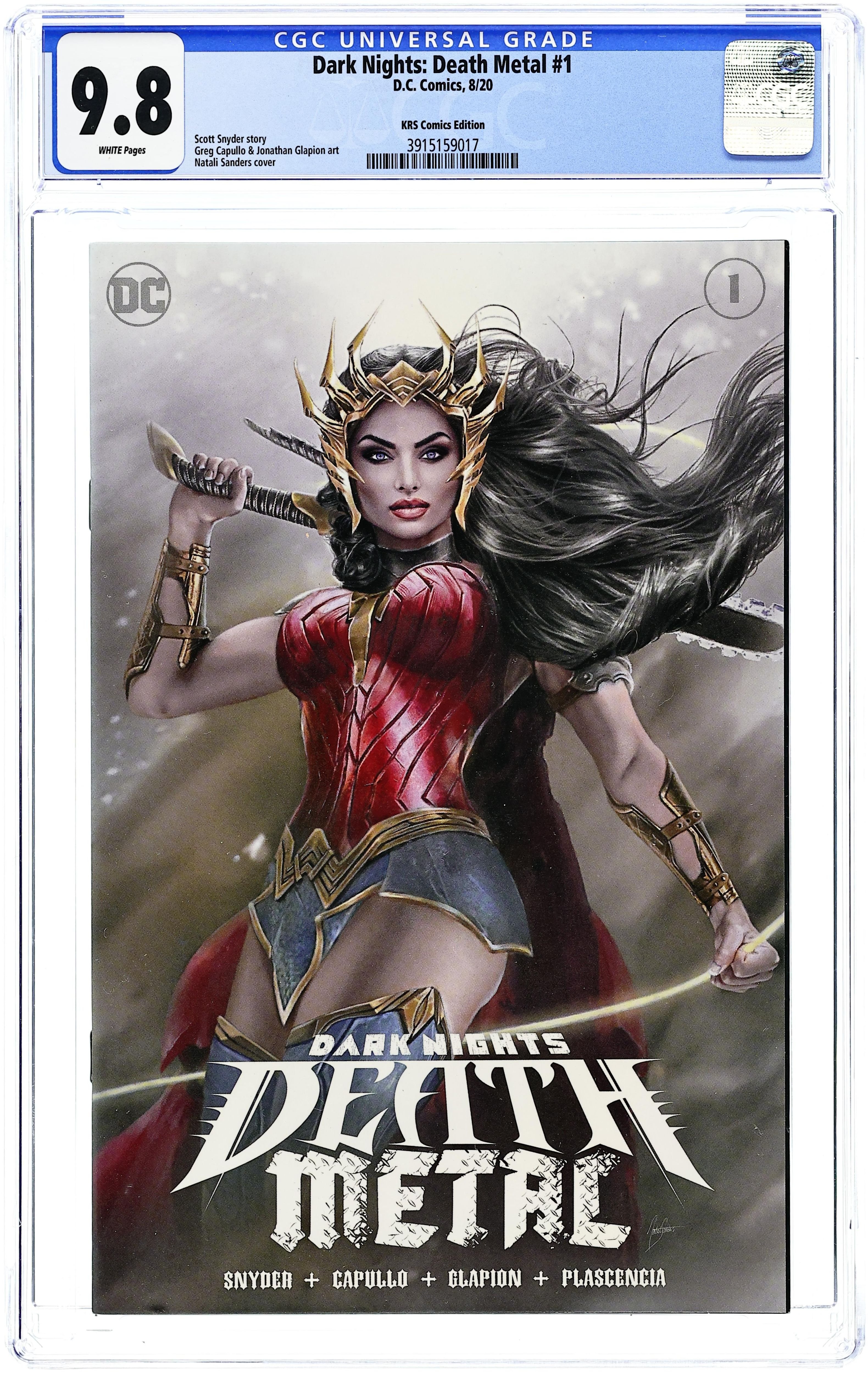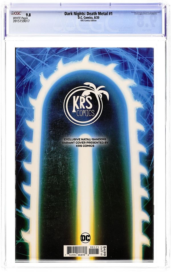 KRS Comics Exclusive Variant Cover by Natali Sanders. Written by Scott Snyder. Art by Greg Capullo and Jonathan Glapion. Get ready for the earth-shattering encore! The legendary team behind Dark Nights: Metal and Batman: Last Knight on Earth take center stage and reunite for one last tour. When the Earth is enveloped by the Dark Multiverse, the Justice League is at the mercy of the Batman Who Laughs. Humanity struggles to survive in a hellish landscape twisted beyond recognition, while Batman, Wonder Woman, and Superman have all been separated and fight to survive. Unleash the beast and let the head banging begin! 32 pages, full color. Rated T+