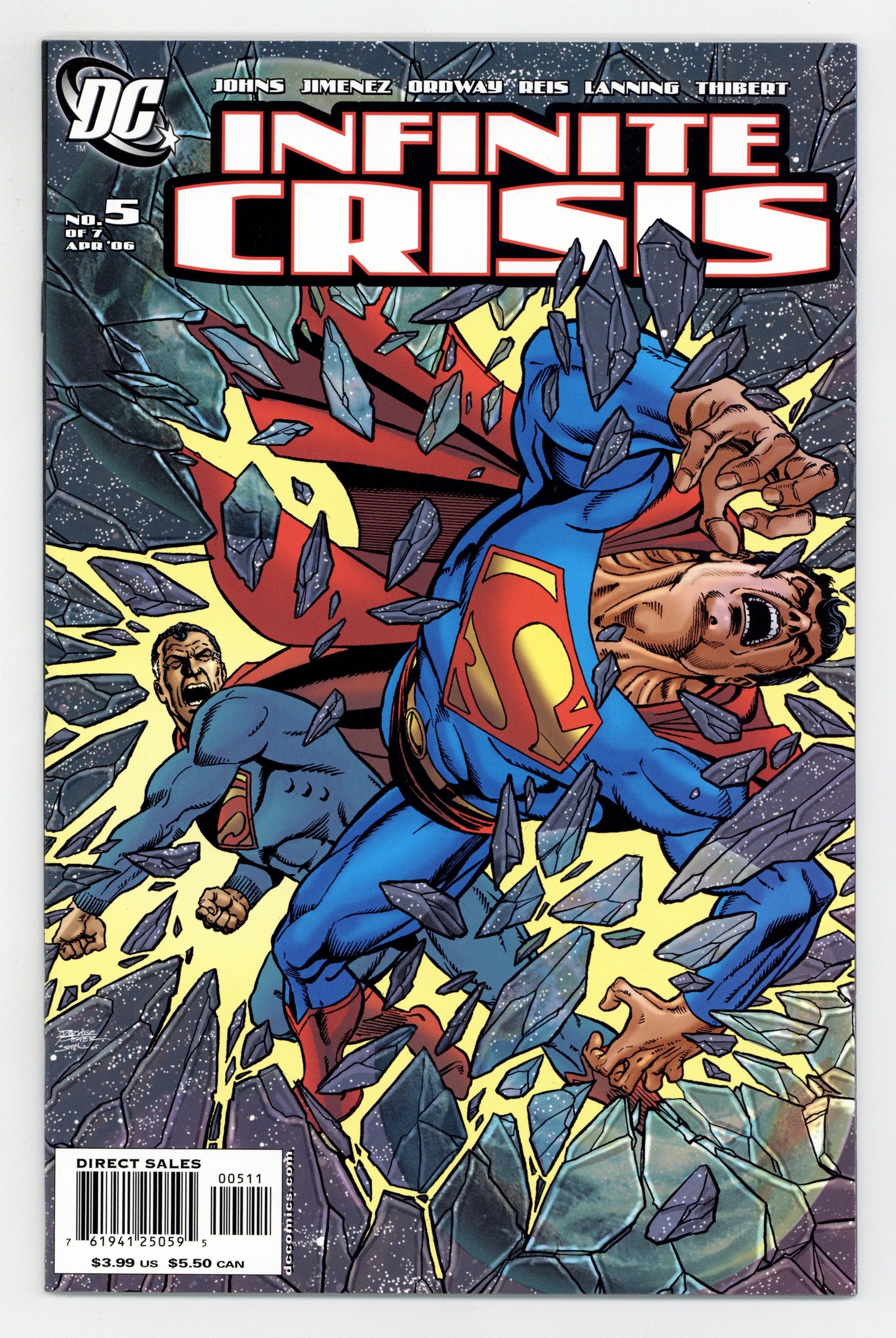 George Perez Cover - Written by Geoff Johns Art by Phil Jimenez & Andy Lanning. Covers by Jim Lee & Sandra Hope and George Pérez. 1st costumed appearance of the third Blue Beetle. (for 1st appearance as Jaime Reyes, see Infinite Crisis #3). The DCU shakes apart as Superman of Earth 2 finally confronts our Superman. Meanwhile, heroes are disappearing throughout the DC Universe, a transformed villain returns, and the mystics of every world and dimension seek help from the very Spirit that is destroying them. Retailers please note: This issue will ship with covers by Lee & Hope (approximately 50%) and Pérez (approximately 50%). On sale February 15 ? 5 of 7 ? 40 pg, FC, $3.99 US Cover price $3.99.