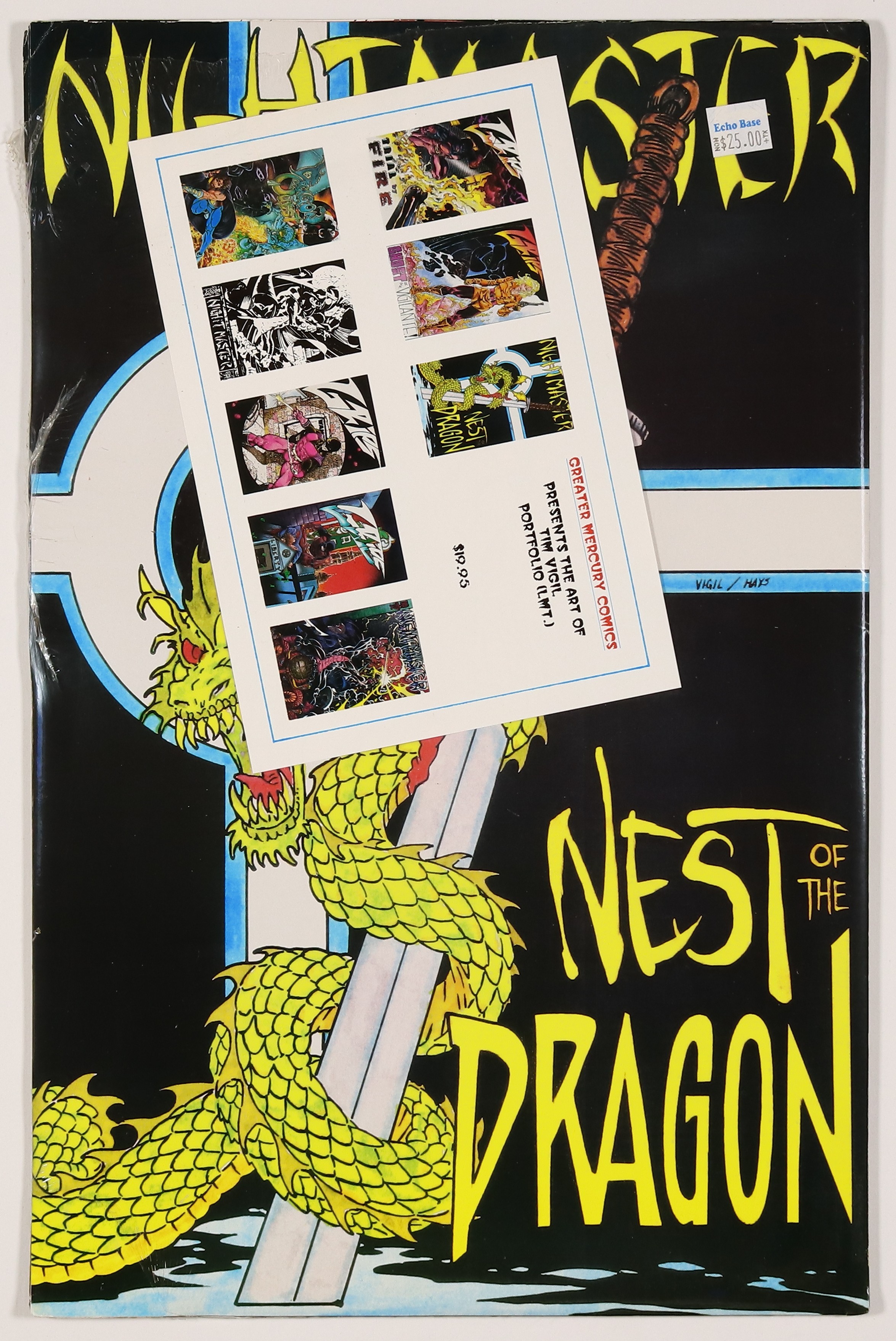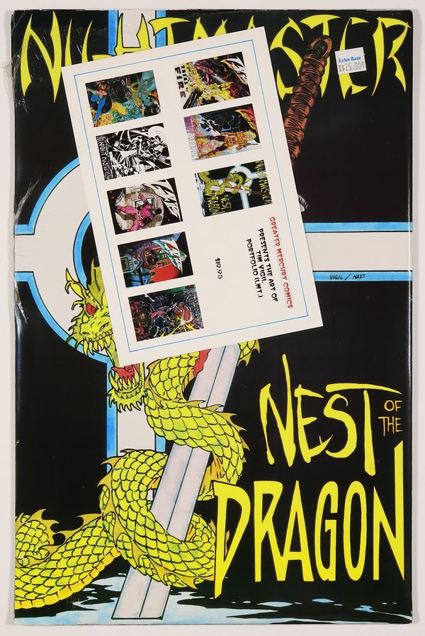 Includes eight 11" x 17" prints featuring Tim Vigil's art from Grips, Nightmaster, and Dragon Quest. Originally distributed in shrinkwrap with cardboard backing. Cover price $19.95.