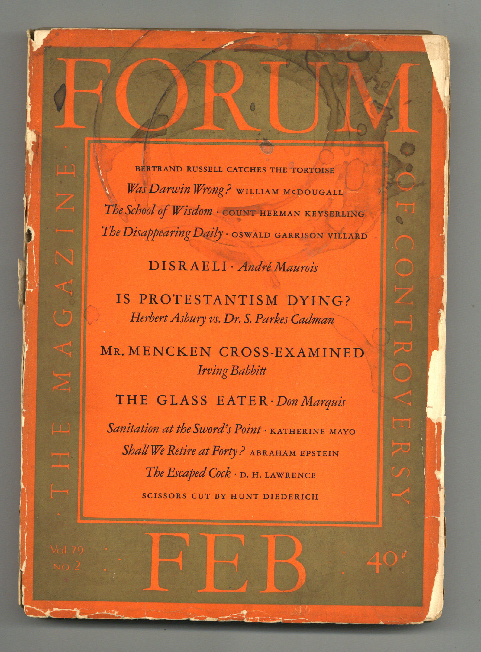 Published Feb 1928 by Forum Publishing Company.$7.20- Front cover detached 70%. Cover Wrap Detached. Water damage: Slight. Staple rust: Slight.