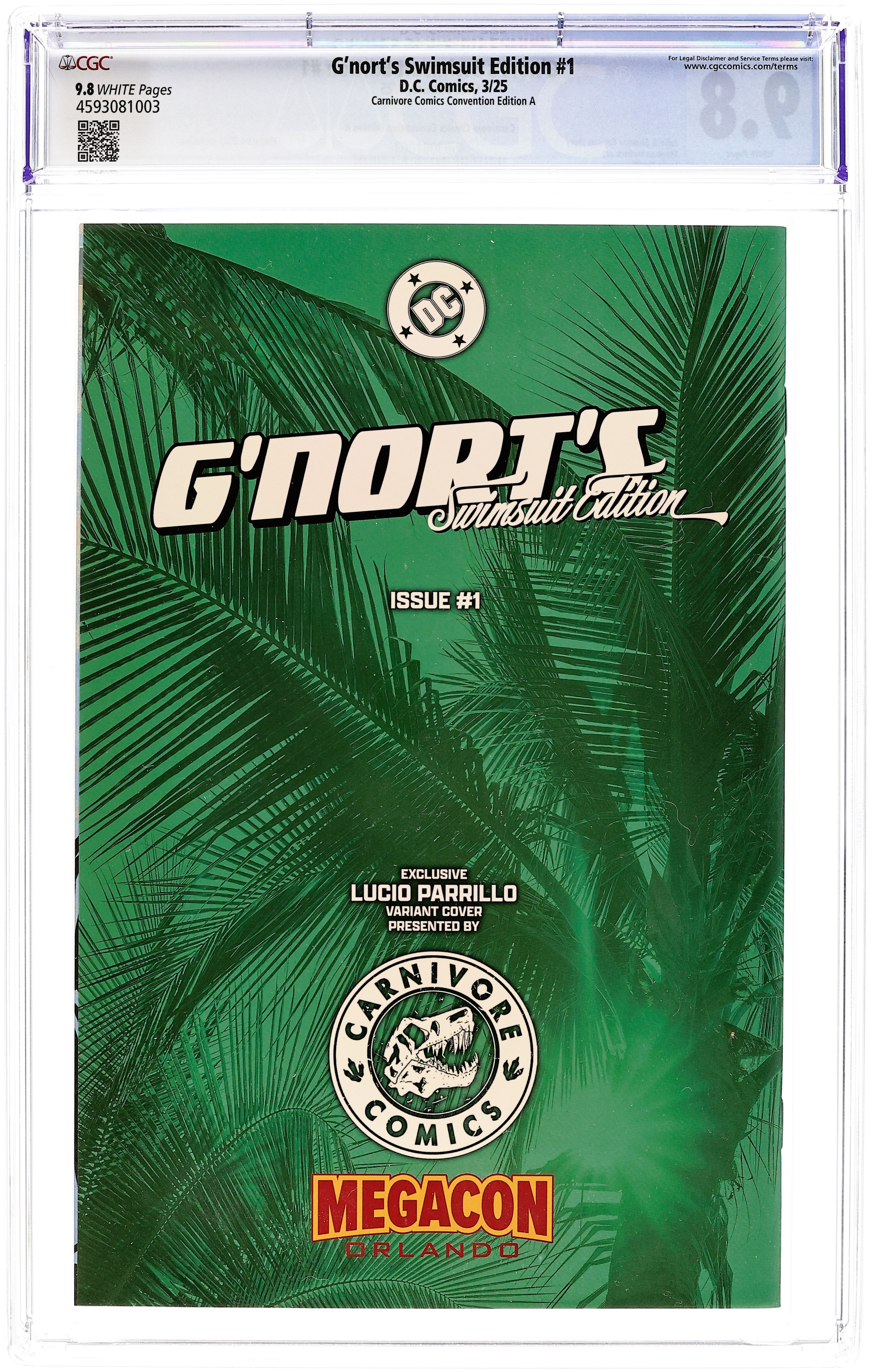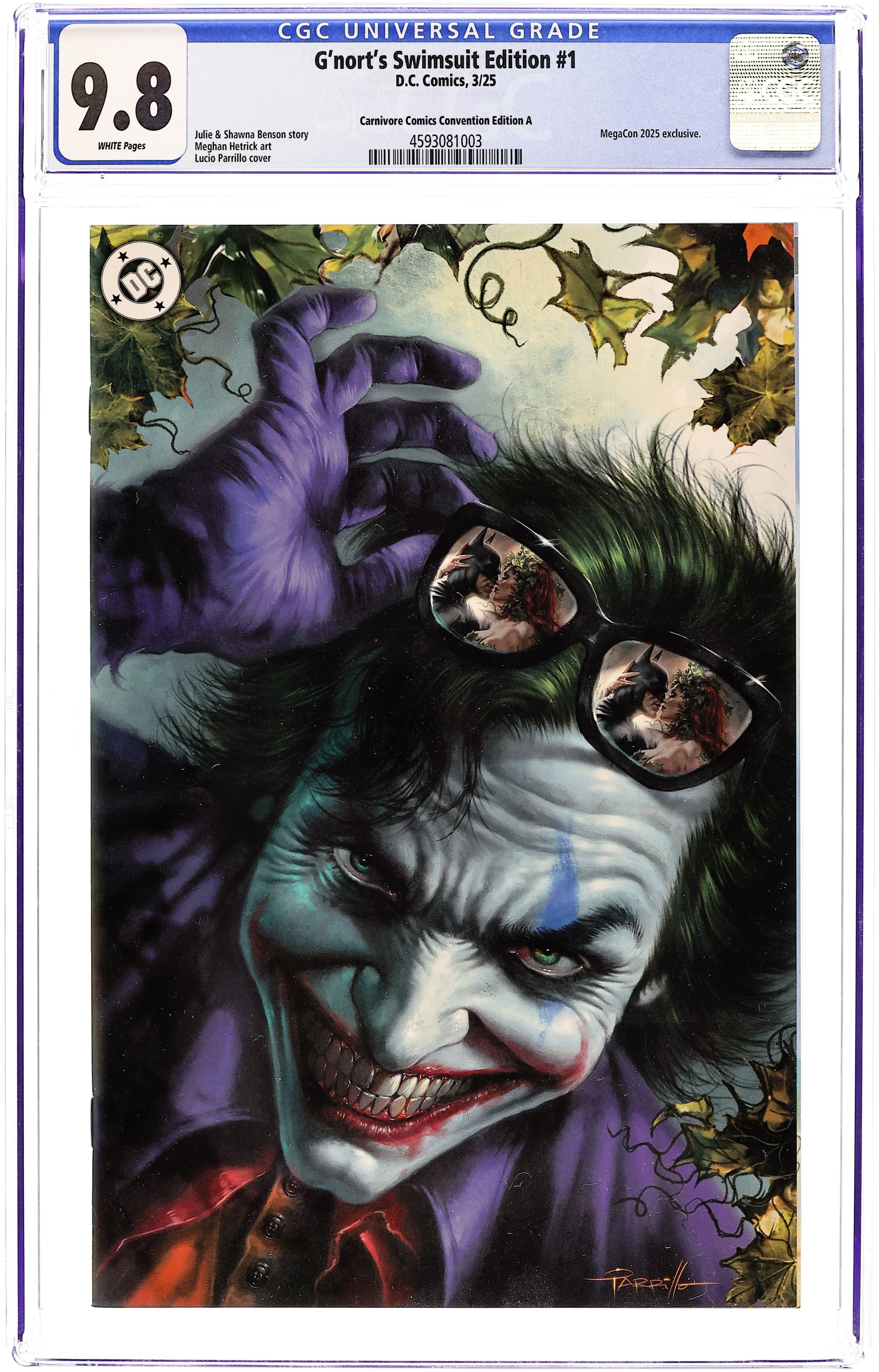 Carnivore Comics MegaCon Exclusive "Joker" Edition Virgin Cover by Lucio Parrillo. Written by Steve Orlando, Various. Art by Various. FUN IN THE SUN STARRING...G'NORT! Art by Paul Pelletier, Nicola Scott, Mikel Janin, Jeff Dekal, Daniel Sampere, Gleb Melnikov, Derrick Chew, Stanley Artgerm Lau, Emanuela Lupacchino, Joelle Jones, Megan Huang, Terry Dodson, Babs Tarr, Pete Woods, Joe Quinones, Helene Lenoble, Otto Schimdt, Michael Allred, Sweeney Boo, David Talaski, Jenny Frison, and others! You may know G'nort as the bumbling Green Lantern who protects Space Sector 68. Then again, you may not know G'nort at all. Whatever the case, get ready to see him in his newest role as host and proprietor of this very special swimsuit edition comic! Join our favorite fuzzball as he showcases some of our best swimsuit covers and our most swim-tacular stories! From the Flash in a Speed Force Speedo to Batman in a bat(hing) suit, this very special one-shot is summer fun from (bikini) top to (bikini) bottom. Also collecting some of the steamiest swimsuit covers from DC's best talent, all in one place for the very first time! 54 pages, full color. Rated T+