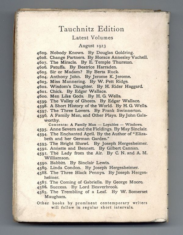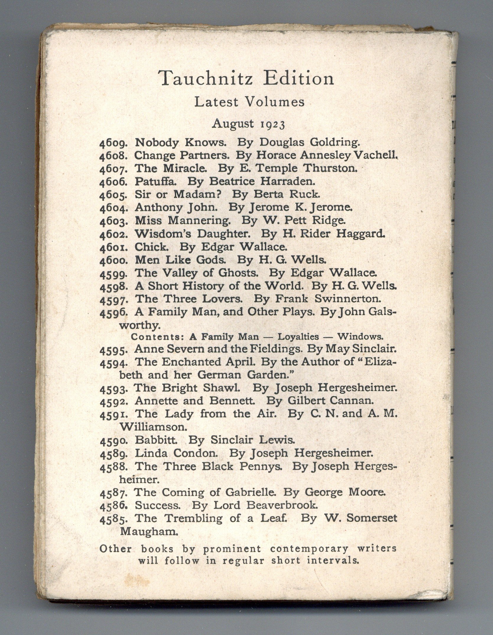 Published Aug 1923 by Bernhard Tauchnitz.$6.00- Water damage: Extensive.