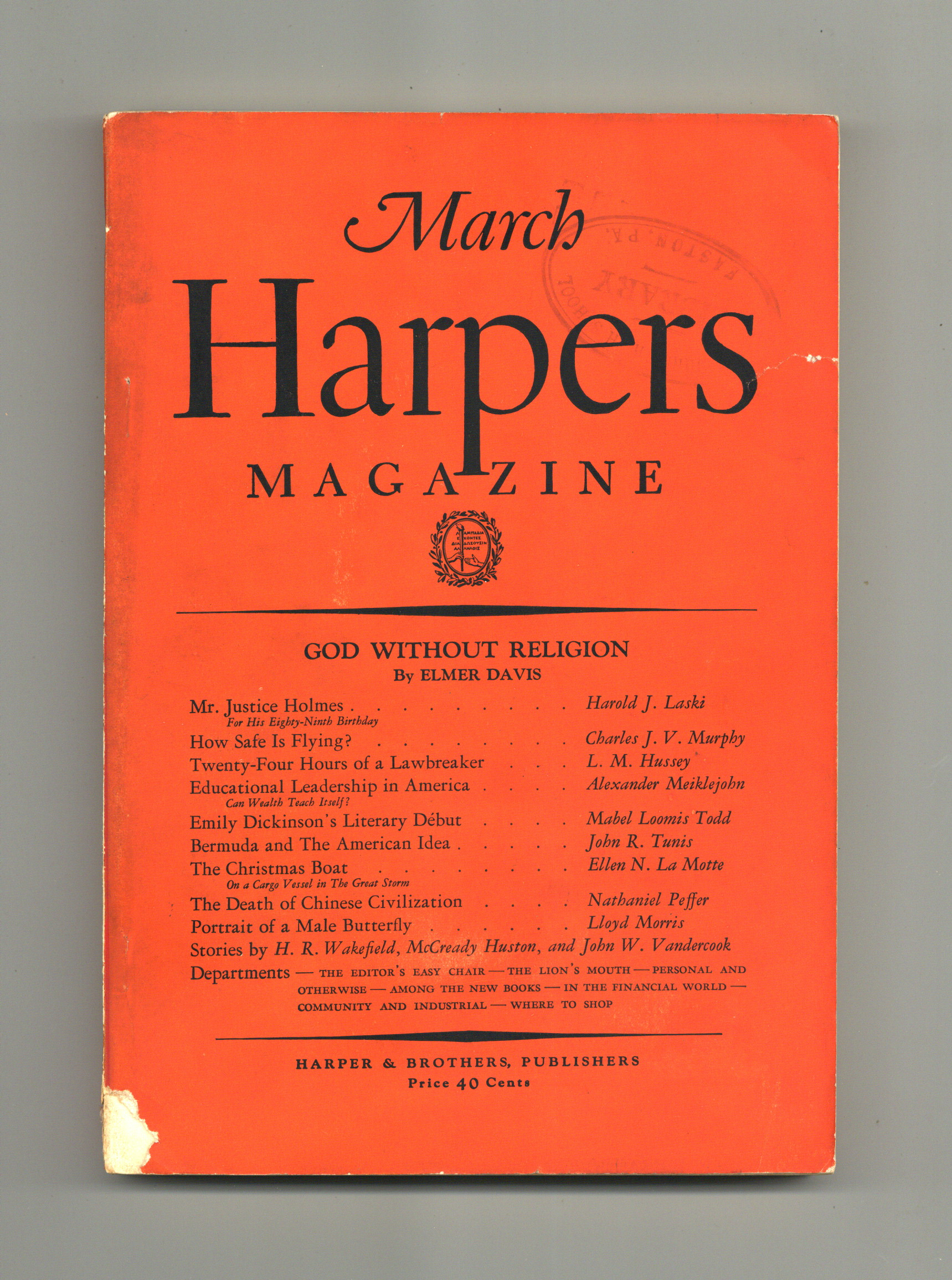 Published Mar 1930 by Harper & Brothers Publish.$38.00- Front cover detached 5%. Staple rust: Slight.