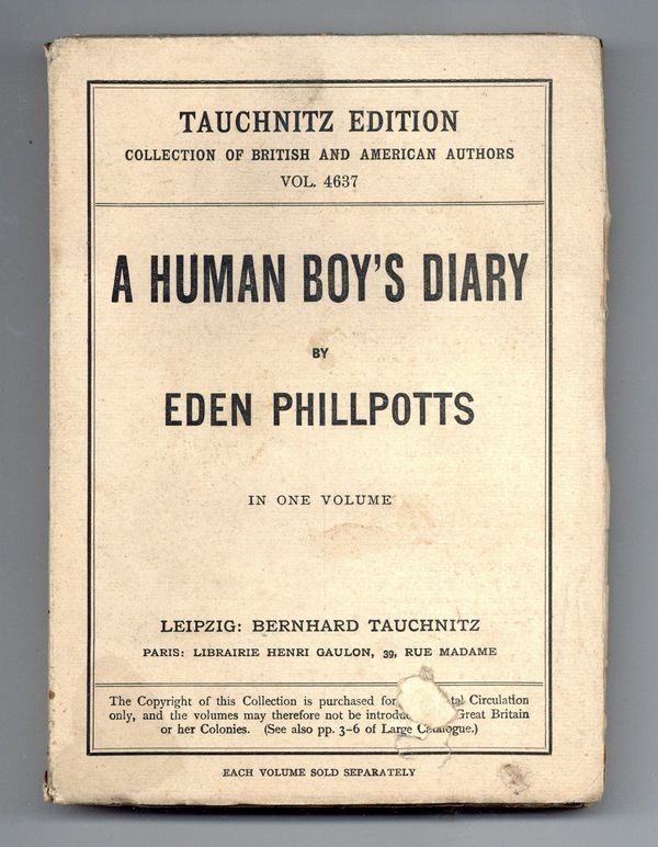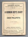 A Human Boy's Diary by Eden Phillpotts. Tauchnitz published English language literature for distribution on the European continent outside Great Britain. 4.5" x 6.5", 256 pages, text.