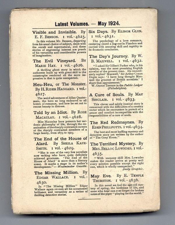 Published May 1924 by Bernhard Tauchnitz.$22.00- Front cover detached 5%.