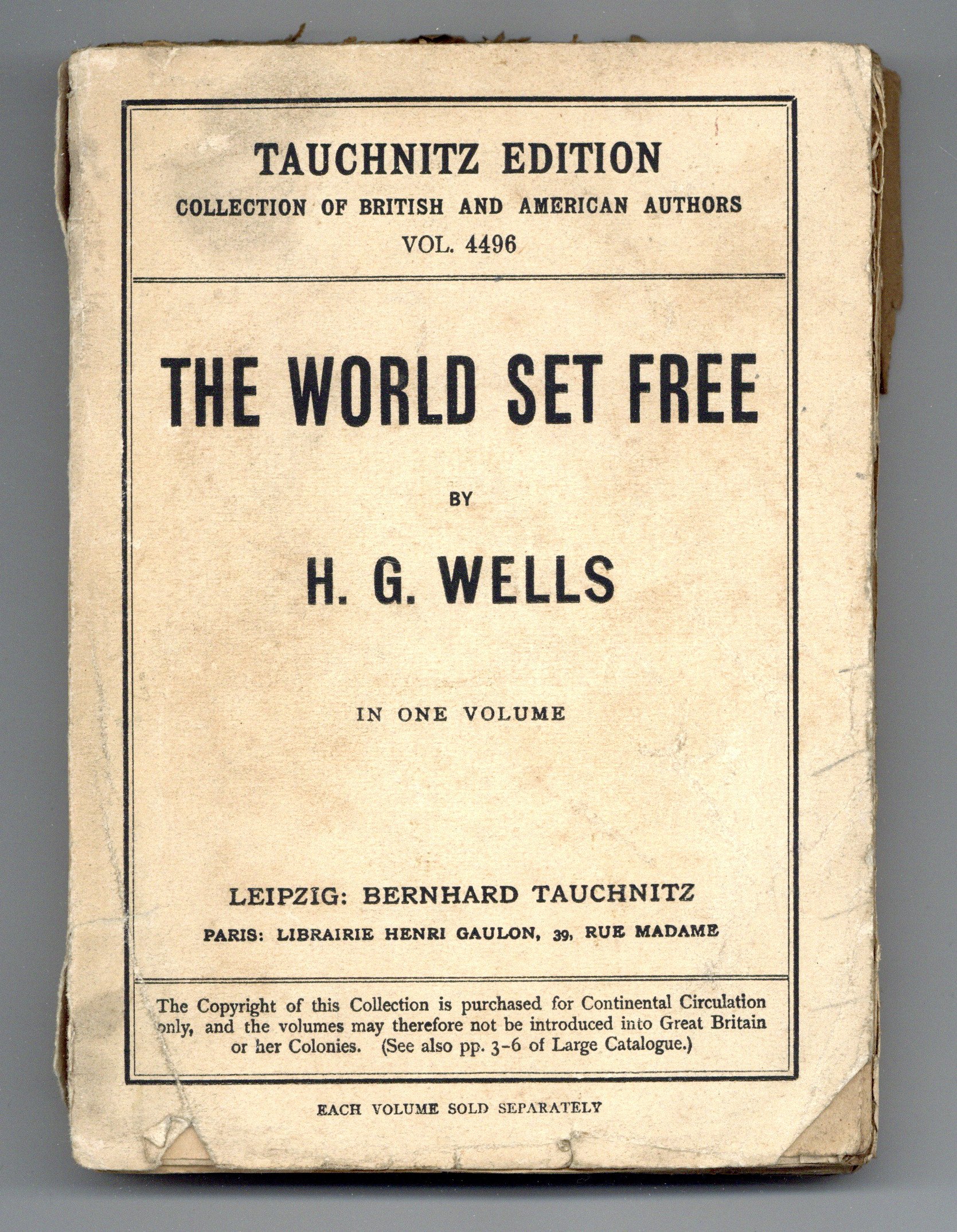 The World Set Free by H. G. Wells. Tauchnitz published English language literature for distribution on the European continent outside Great Britain. 4.5" x 6.5", 288 pages, text.