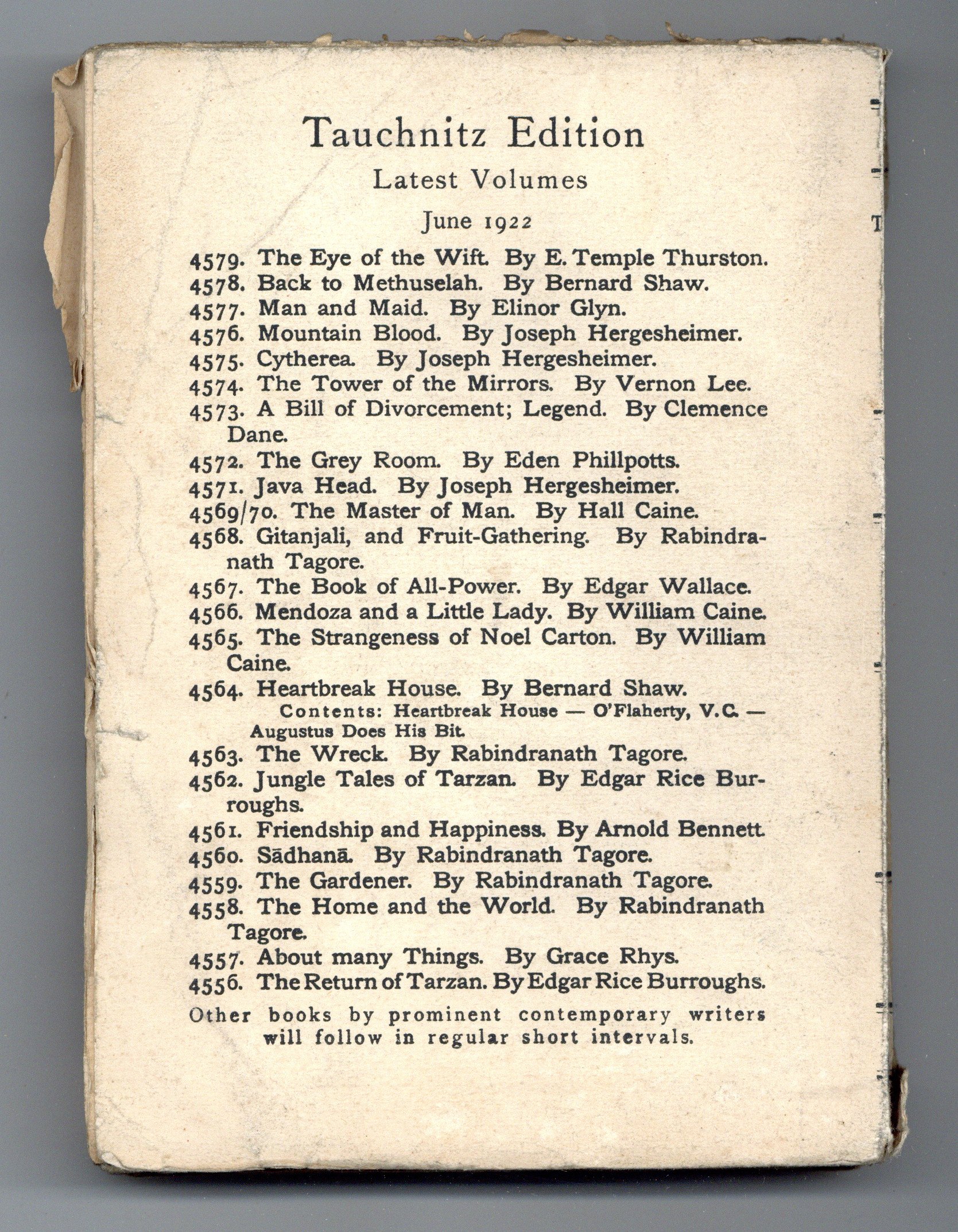 Published Jun 1922 by Bernhard Tauchnitz.$6.00- Front cover detached 40%. Back cover detached 5%.