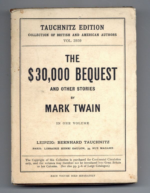 The $30,000 Bequest and Other Stories by Mark Twain. Tauchnitz published English language literature for distribution on the European continent outside Great Britain. 4.5" x 6.5", 304 pages, text.