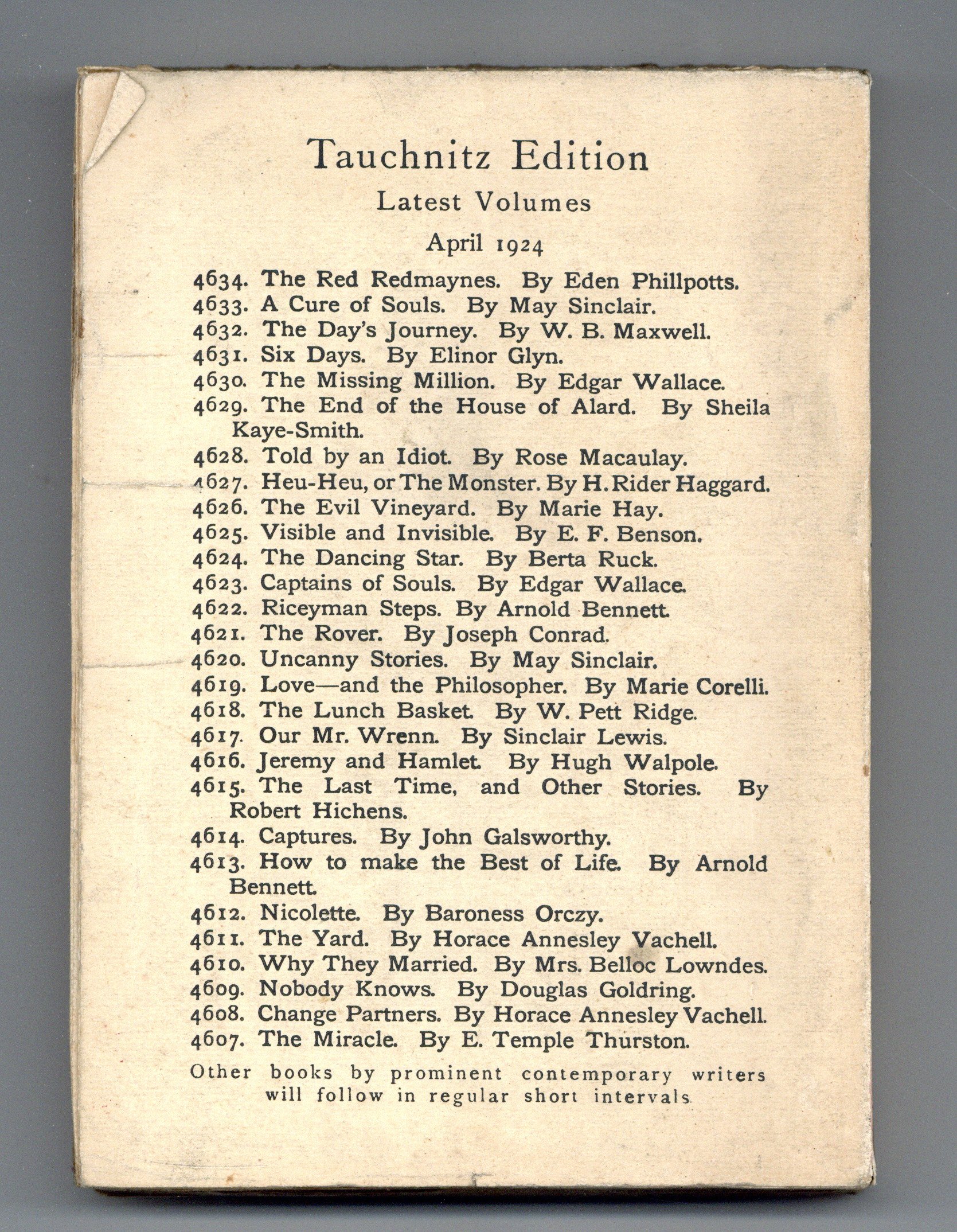 Published Apr 1924 by Bernhard Tauchnitz.$24.00- Front cover detached 5%. Back cover detached 5%.