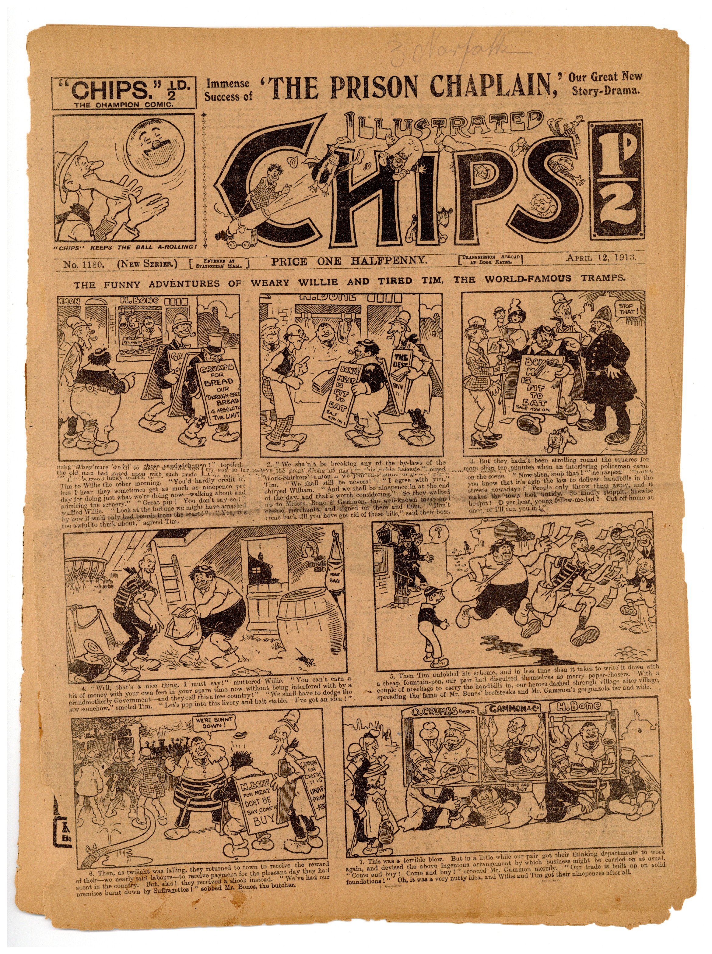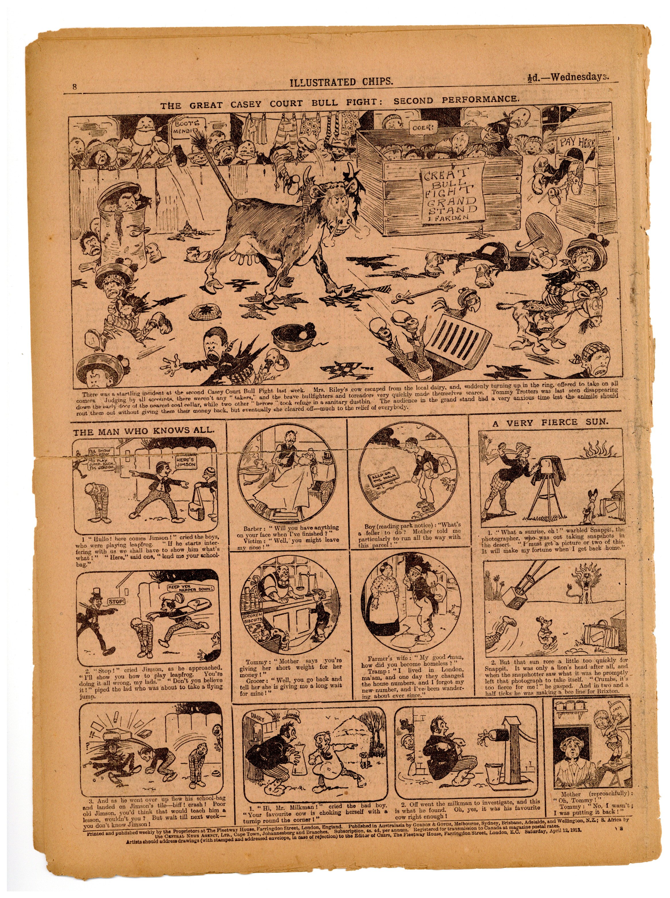 Published Apr 1913 by Amalgamated Press.$2.65April 12, 1913. Illustrated Chips was a weekly newspaper of comics and stories. 10.75" x 14.75", 8 pages, B&W.