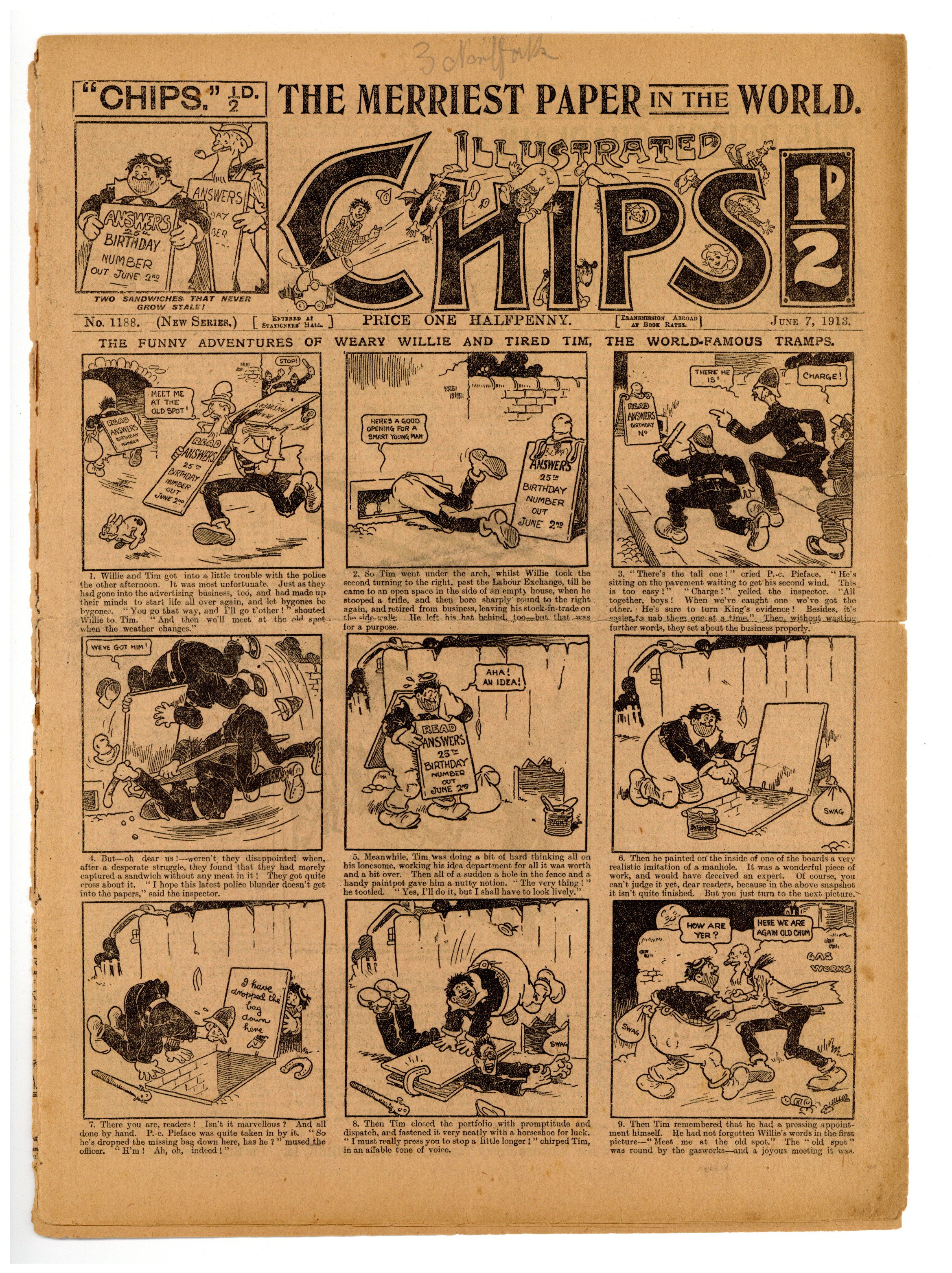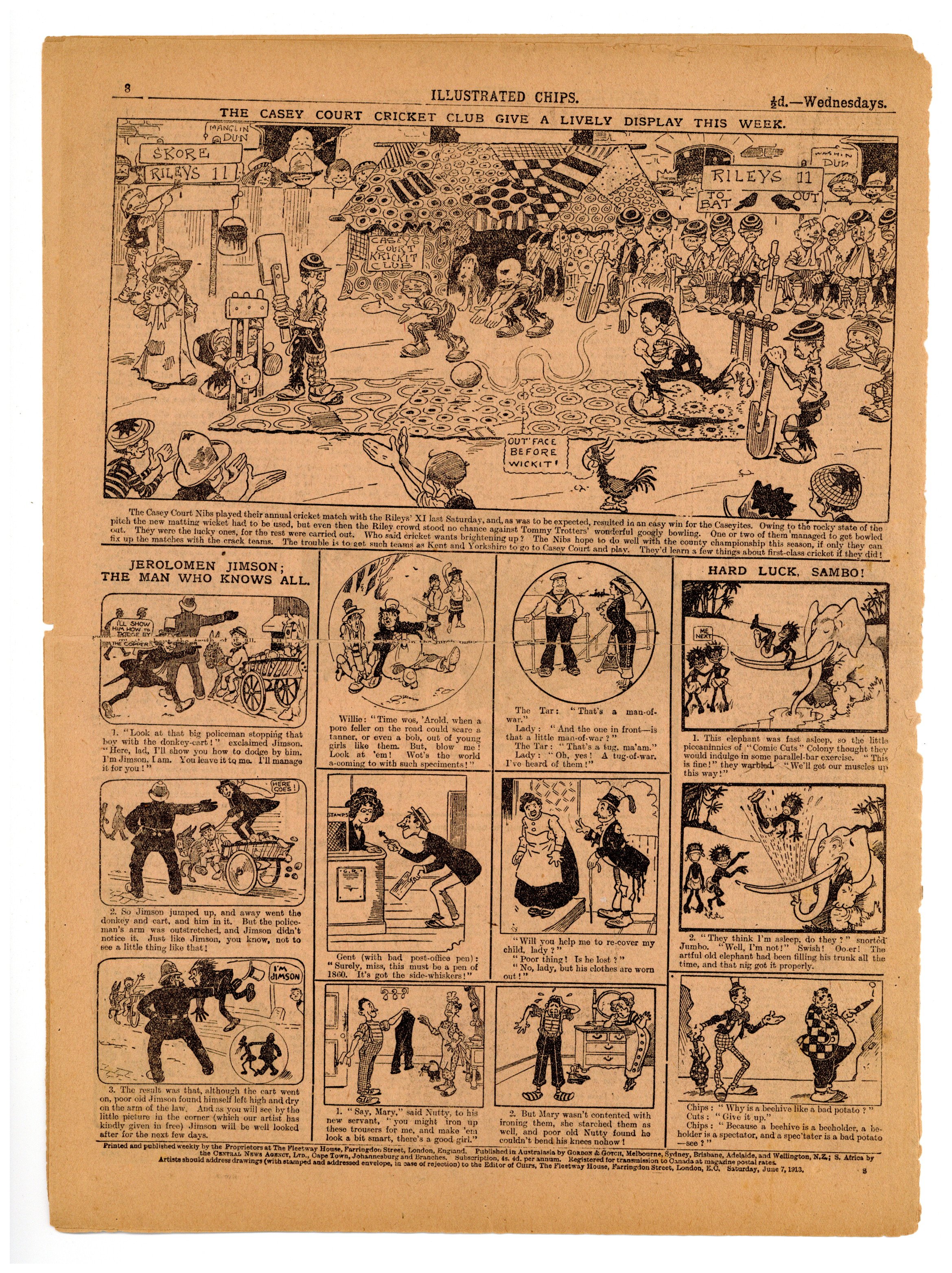 Published Jun 1913 by Amalgamated Press.$2.65June 07, 1913. Illustrated Chips was a weekly newspaper of comics and stories. 10.75" x 14.75", 8 pages, B&W.