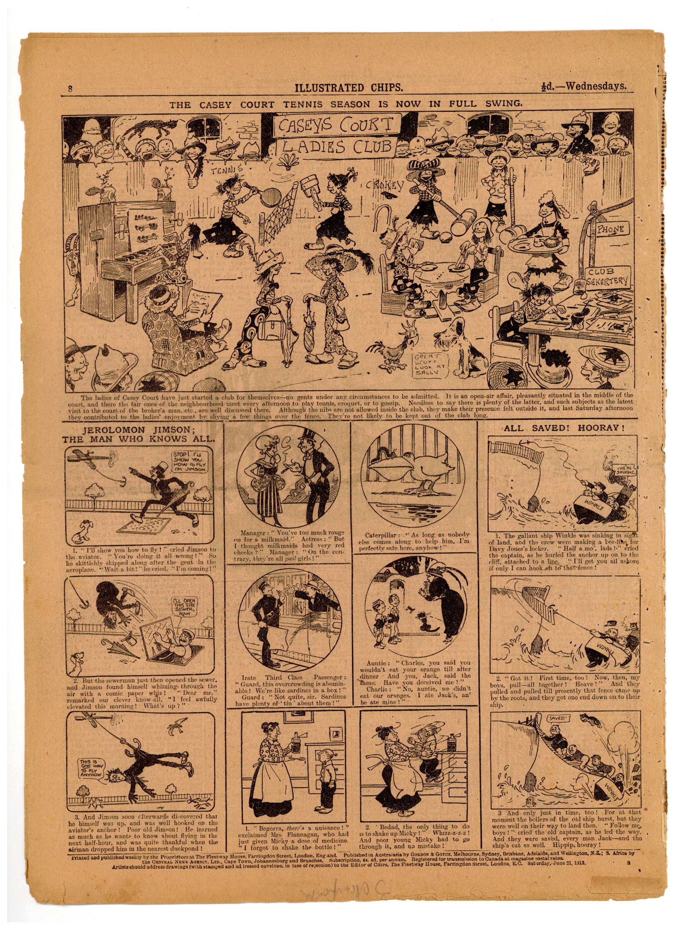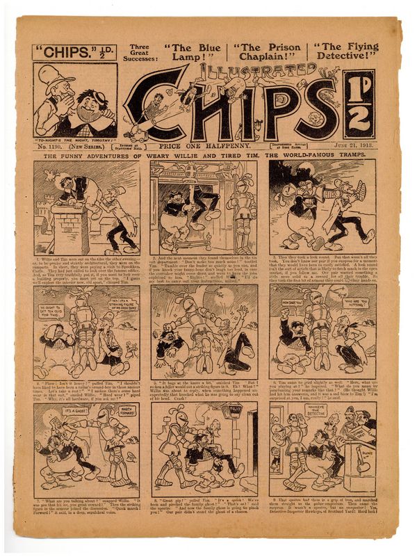 Published Jun 1913 by Amalgamated Press.$4.80June 21, 1913. Illustrated Chips was a weekly newspaper of comics and stories. 10.75" x 14.75", 8 pages, B&W.