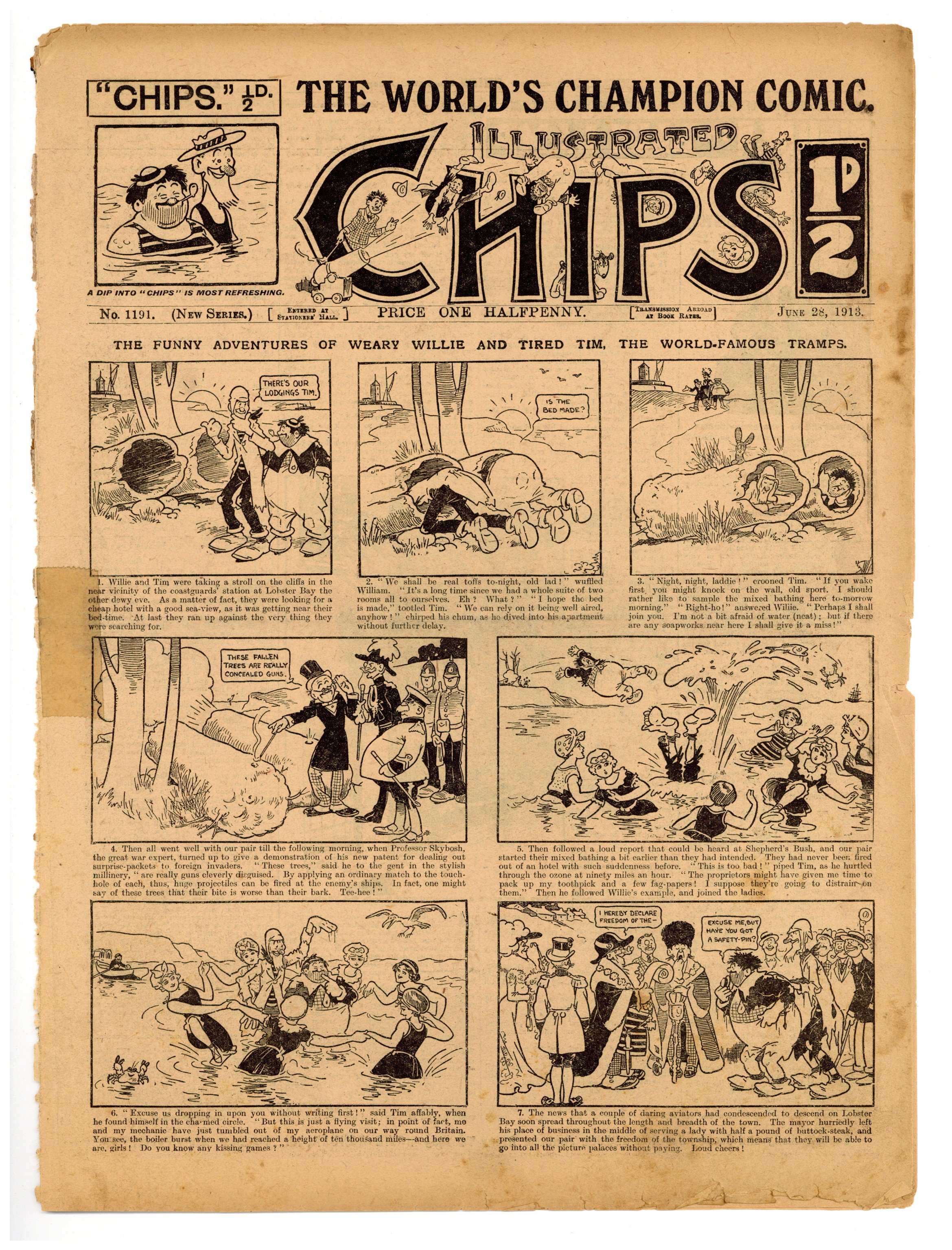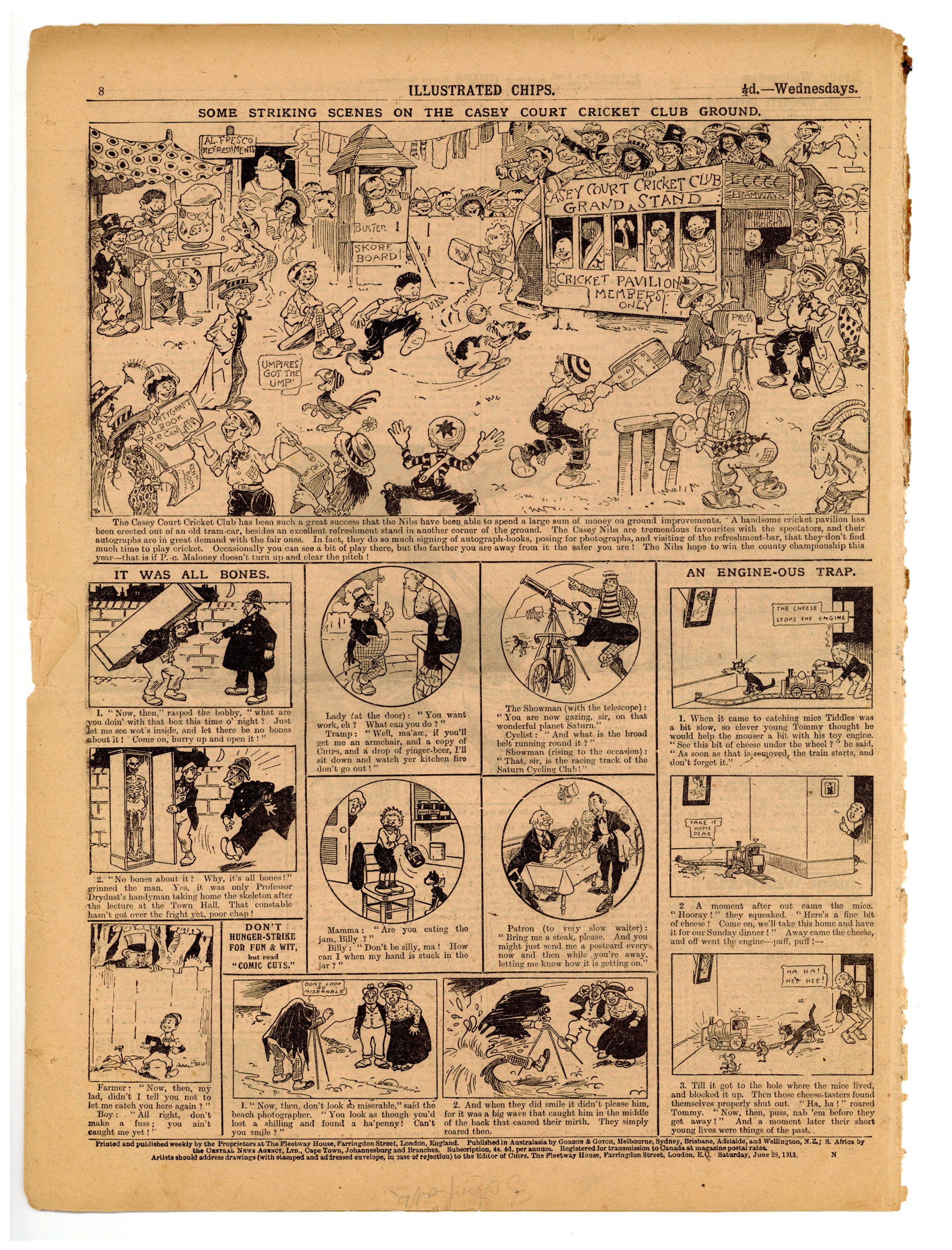 Published Jun 1913 by Amalgamated Press.$4.80June 28, 1913. Illustrated Chips was a weekly newspaper of comics and stories. 10.75" x 14.75", 8 pages, B&W.