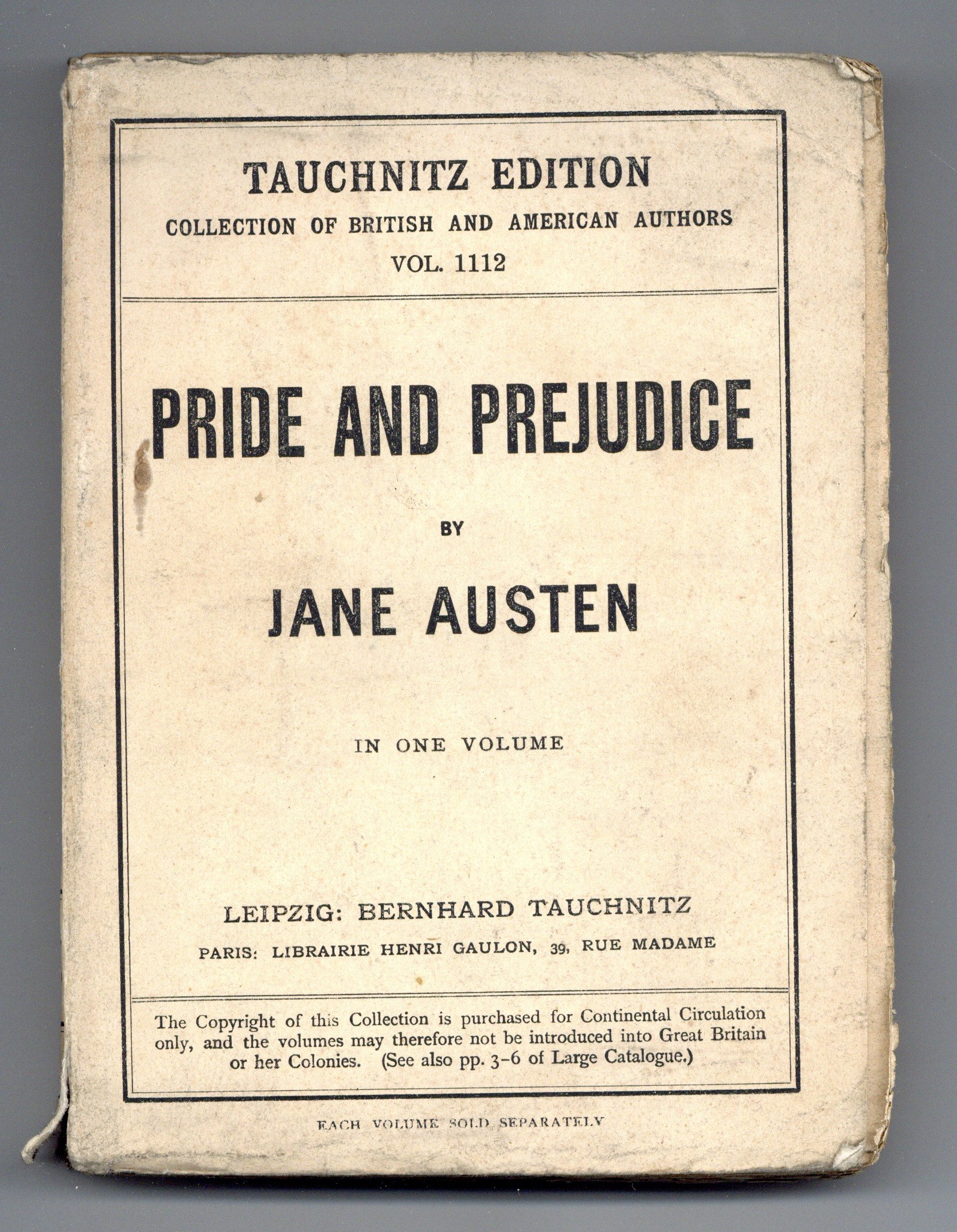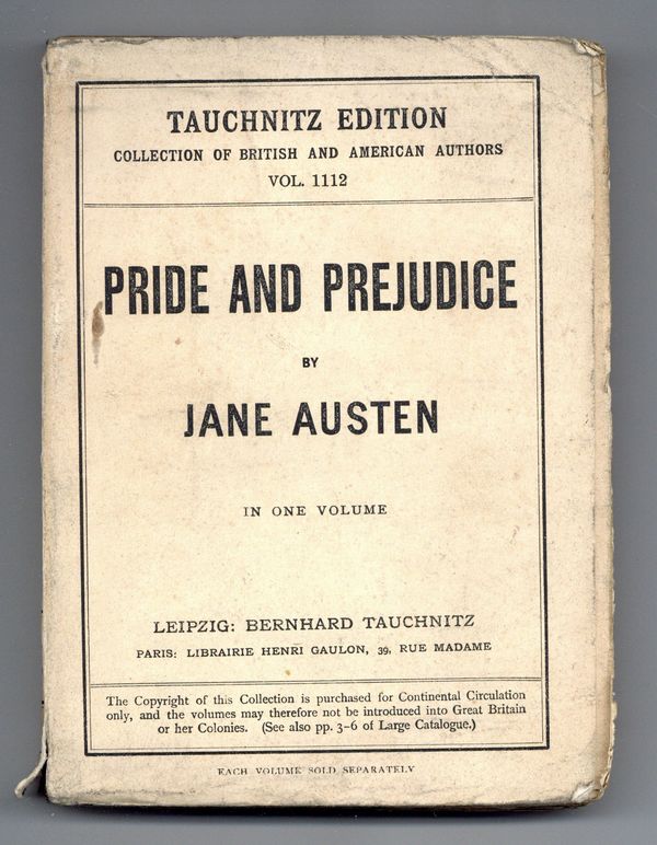 Pride and Prejudice by Jane Austen. Tauchnitz published English language literature for distribution on the European continent outside Great Britain. 4.5" x 6.5", 358 pages, text.