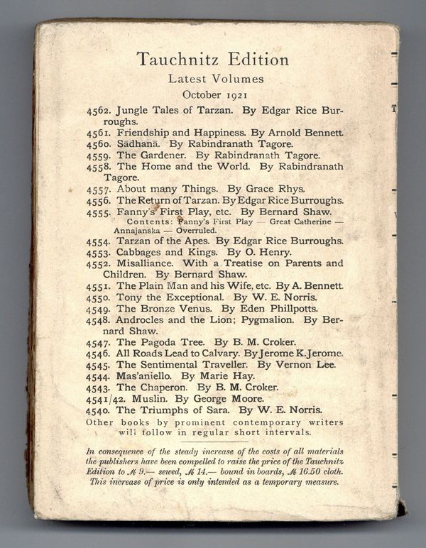 Published Oct 1921 by Bernhard Tauchnitz.$22.00- Front cover detached 5%. Back cover detached 5%.