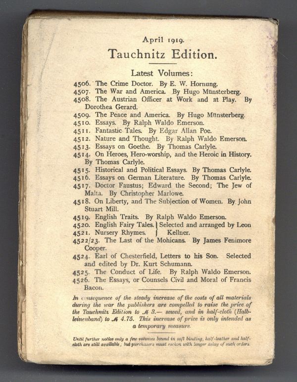 Published Apr 1919 by Bernhard Tauchnitz.$72.00- Front cover detached 30%. Back cover detached 5%.