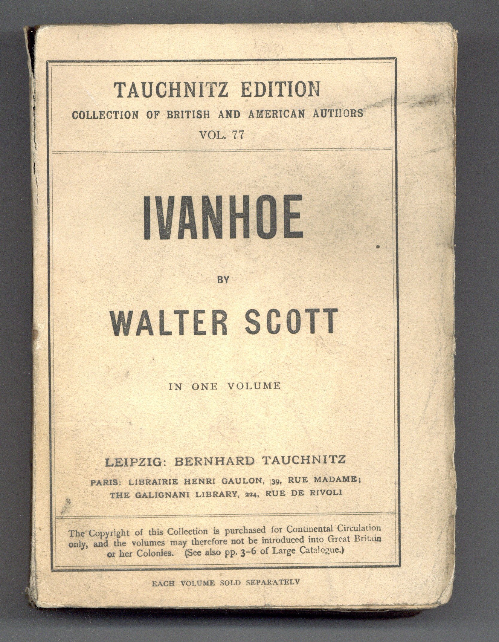 Ivanhoe by Walter Scott. Tauchnitz published English language literature for distribution on the European continent outside Great Britain. 4.5" x 6.5", 568 pages, text.