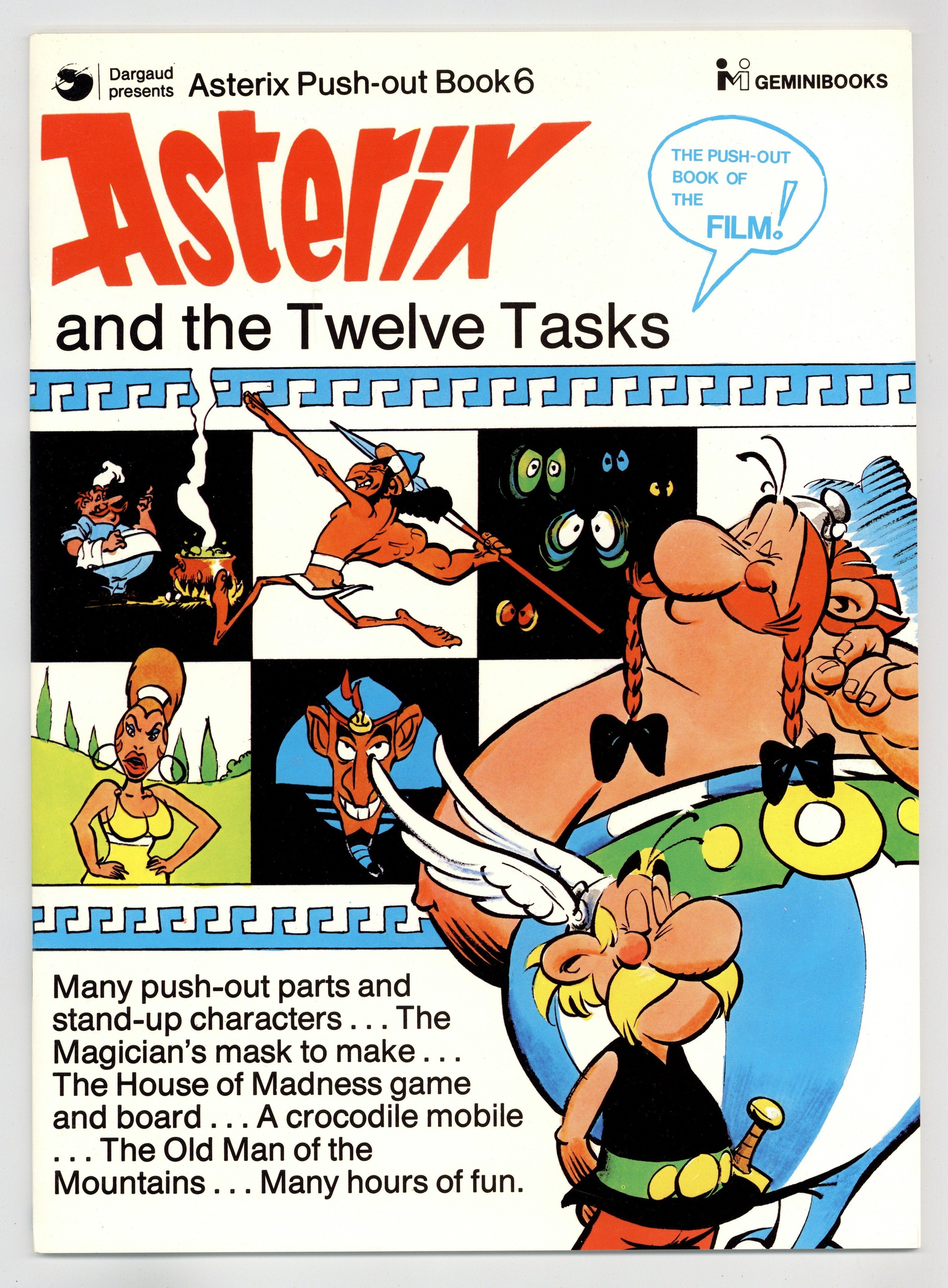 Asterix and the Twelve Tasks. Text by Anthea Bell. Color art and games by John Grace and Sam Thompson. Push-out book with character stand ups and pieces to make "The Magician's mask", "The House of Madness" game and board, a crocodile mobile, and "The Old Man of the Mountains. 9" x 12-1/4", 28 pages, PC/PB&W.