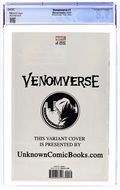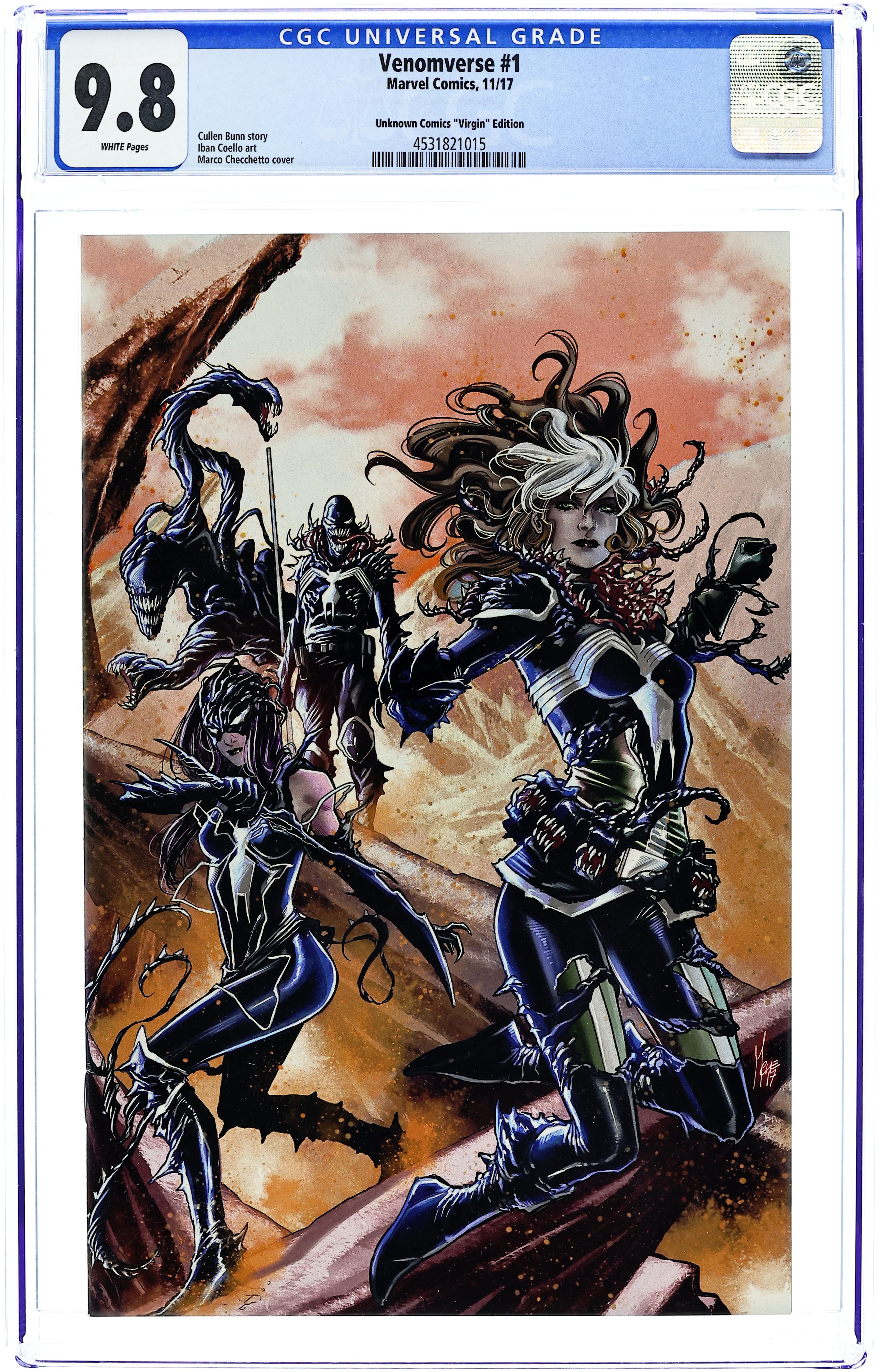 Unknown Comic Books Exclusive Virgin Cover by Marco Checchetto. Written by Cullen Bunn. Art by Iban Coello. THE VENOM EPIC OF THE FALL STARTS HERE! During a routine battle with the villainous Jack O'Lantern, Venom finds himself transported to a far-off world and learns a terrible truth - a deadly new species called the Poisons has emerged from the vastness of space, and to make matters worse, they're hunting Venoms! Trapped on the planet's surface with a ragtag band of Venomized heroes, Eddie has no choice but to mount a counteroffensive and hope to find a way home! 44 pages, full color. Rated T+ Cover price $4.99.