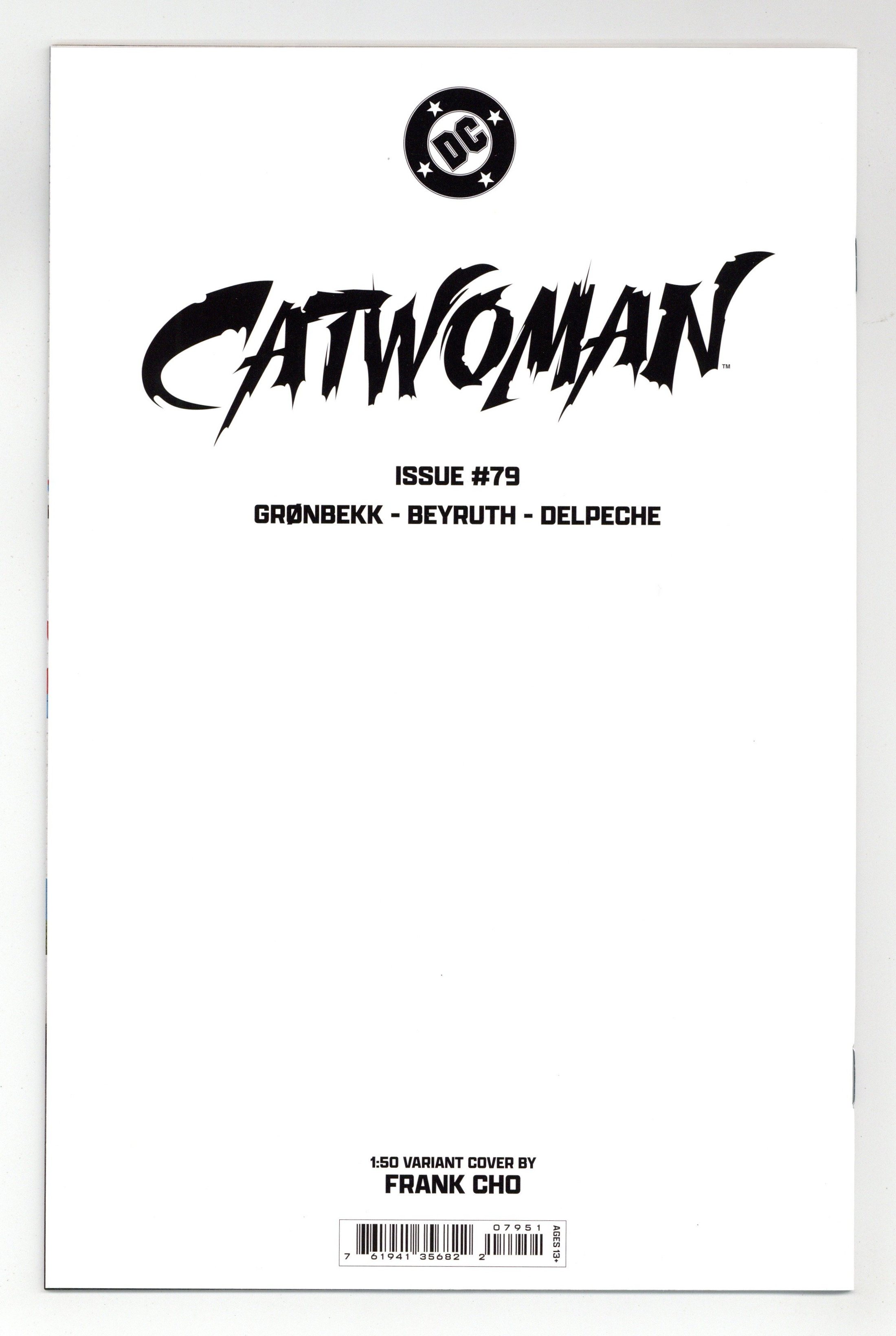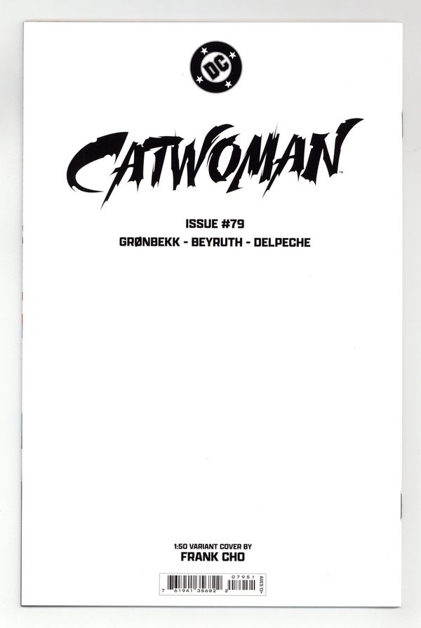 Limited 1 for 50 Retailer Incentive Variant Cover. Written by Torunn Gronbekk. Art by Danilo Beyruth. Cover by Frank Cho. A THRILLING NEW YEAR OF CATWOMAN BEGINS HERE! Selina Kyle is on the hunt for a precious item from her childhood connected to her mother. But when she tracks down its whereabouts, it leads her to...a mysterious auction in Venice being held by a dangerous secret society! Will Catwoman successfully steal a piece of her history, or has the feline fatale finally bitten off more than she can chew? 28 pages, full color. Rated T Cover price $4.99.