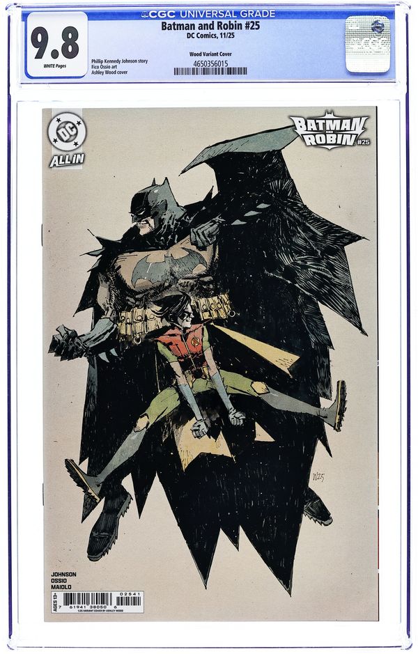 Limited 1 for 25 Retailer Incentive Variant Cover. Written by Phillip Kennedy Johnson. Art by Fico Ossio. Cover by Ashley Wood. A BRAND-NEW ADVENTURE! A BRAND-NEW ROBIN COSTUME! A NEW ARC BEGINS HERE! With Memento's reign of terror at an end, Damian is more committed than ever, both as Robin and as a Wayne of Gotham. But when an unassuming hitman known only as the Quiet Man arrives in Gotham on a mysterious mission of revenge, one of Batman's deadliest enemies thought to be dead returns! A brand new art team, first appearance and of a brand-new villain, and the return of a fan favorite! 32 pages, full color. Rated T+ Cover price $5.99.