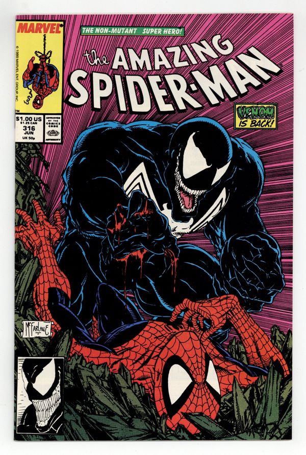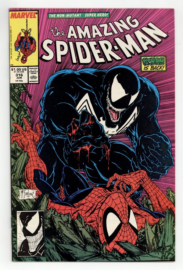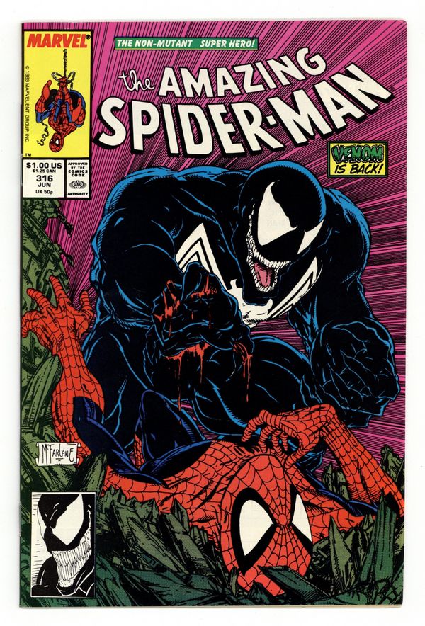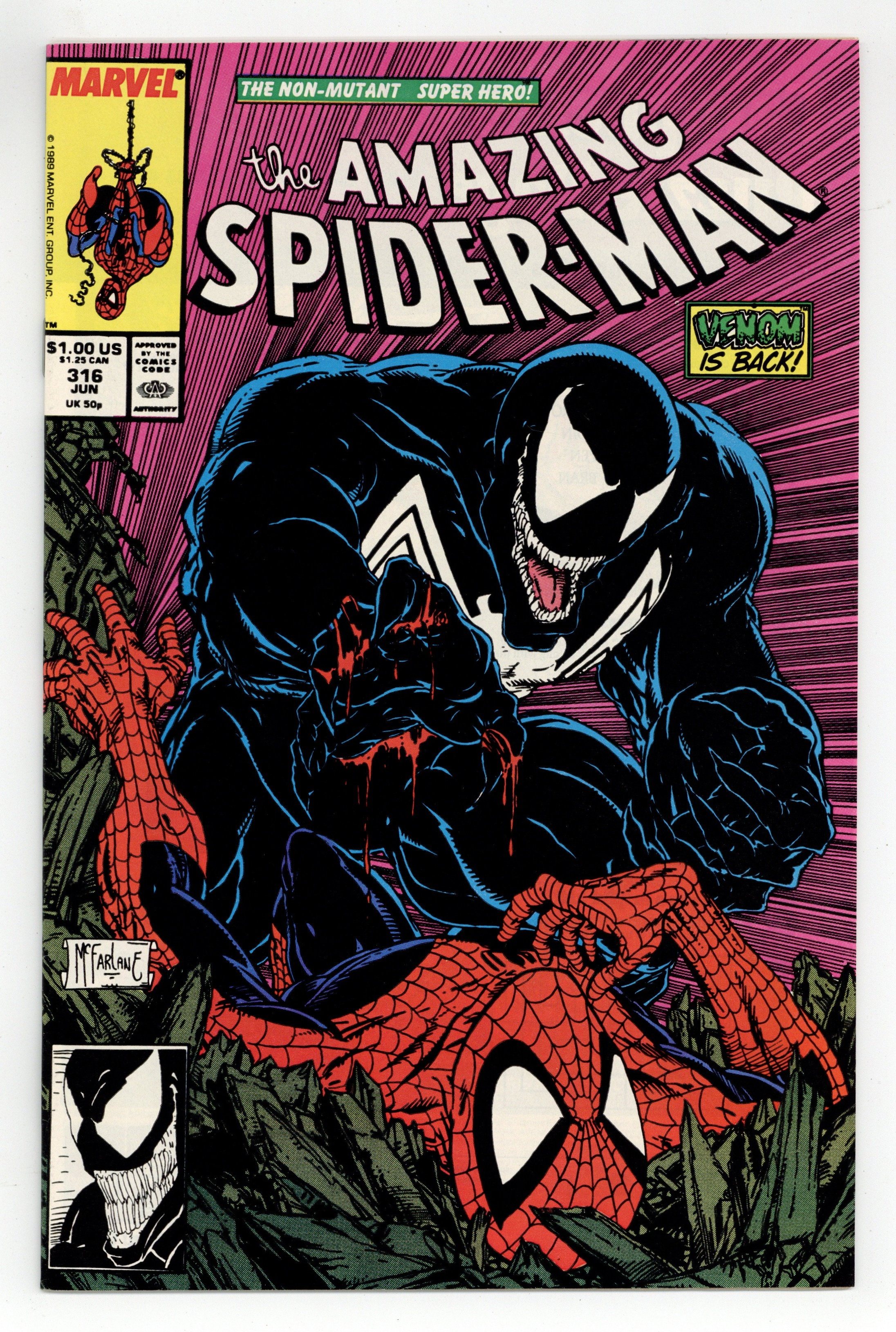 Tags: Marvel Legacy Numbering: Amazing Spider-Man (part 316), Spider-Man$155.00Direct Edition. "Dead Meat" Part 1 of 2. Script by David Michelinie. Art by Todd McFarlane. Cover by Todd McFarlane. Venom is back in New York City! And the deranged Eddie Brock is looking to kill Peter Parker or Spider-Man with extreme prejudice! However, first the psychotic symbiote has to find where the Parkers are living! At the web-slinger's former Bedford Towers residence, Venom runs into and then runs roughshod over the Black Cat! But Felicia doesn't know where the wall-crawler is either! Later on Peter learns that his worst nightmare has returned and his family is in grave danger. Spider-Man can't wait for Venom to make the first move. The web-slinger must attack! Cameo appearances by Aunt May, Glory Grant, and Eduardo Lobo. (Note: This two-part story was reprinted in 1990 in the trade paperback: Spider-Man vs. Venom.) 36 pages. Cover price $1.00.