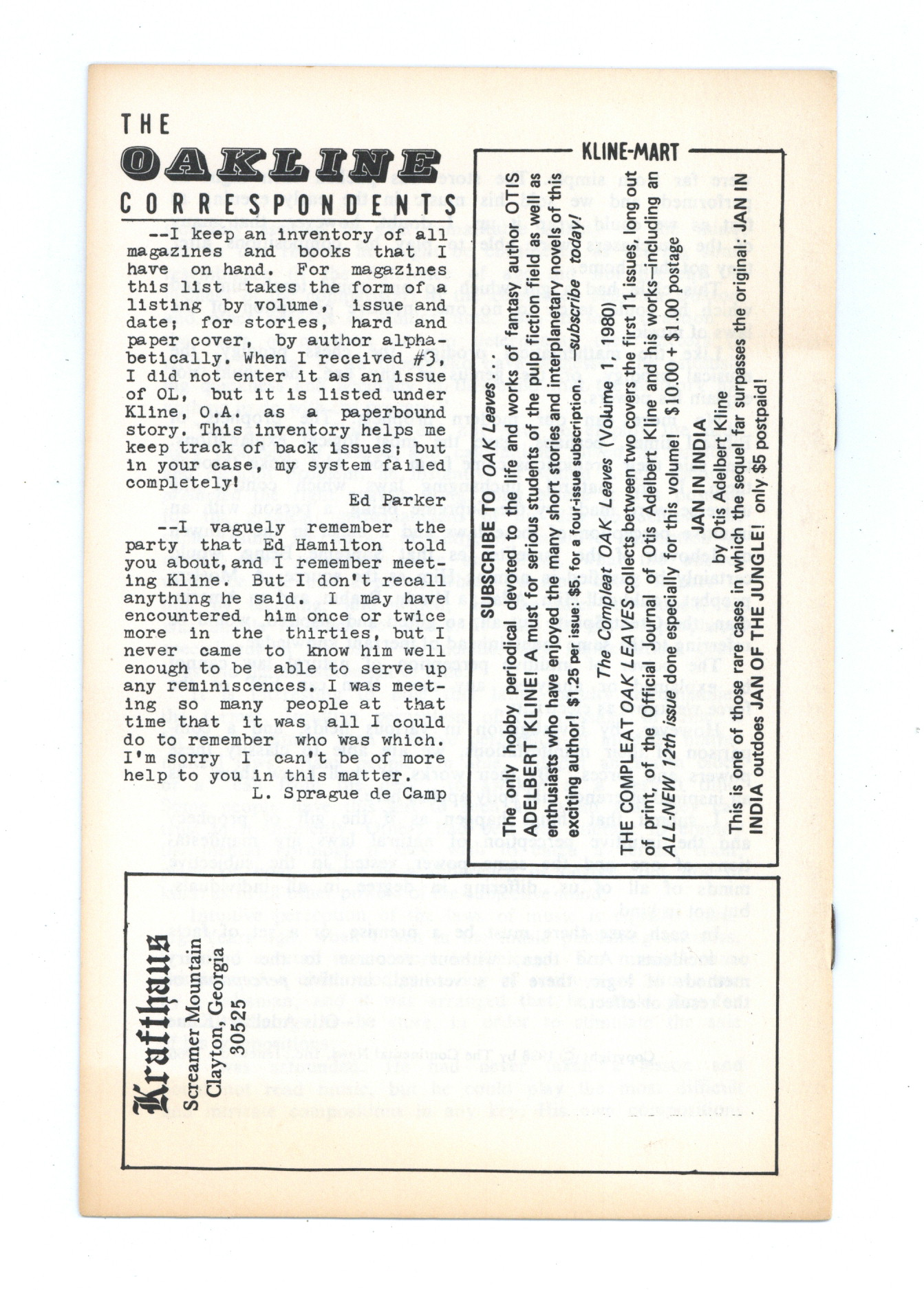 $18.00Vol. 2, No. 15-REP - March 1982. Fanzine devoted to Otis Adelbert Kline and his works. 5.5" x 8.5", 12 pages, B&W. Cover price $1.25.
