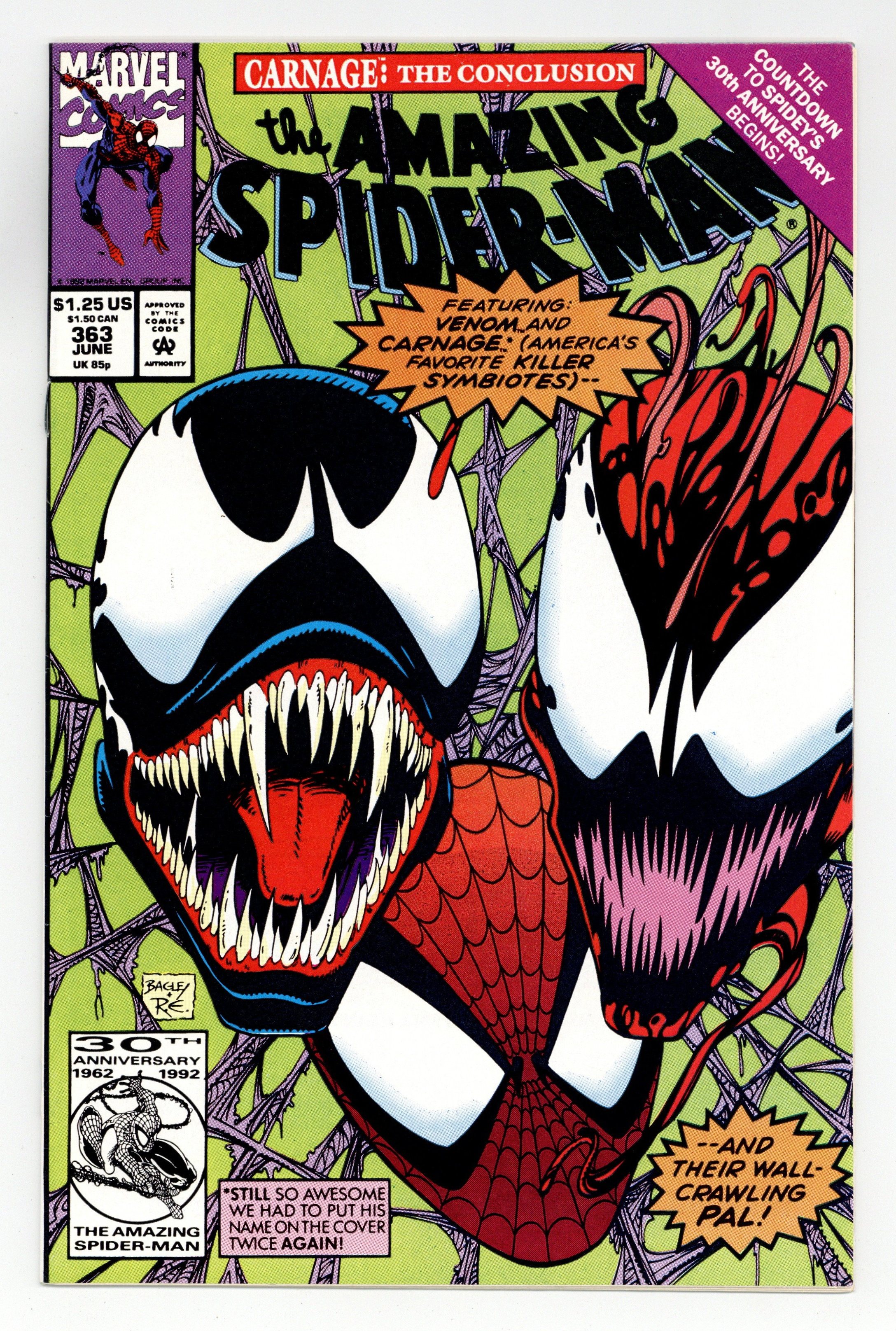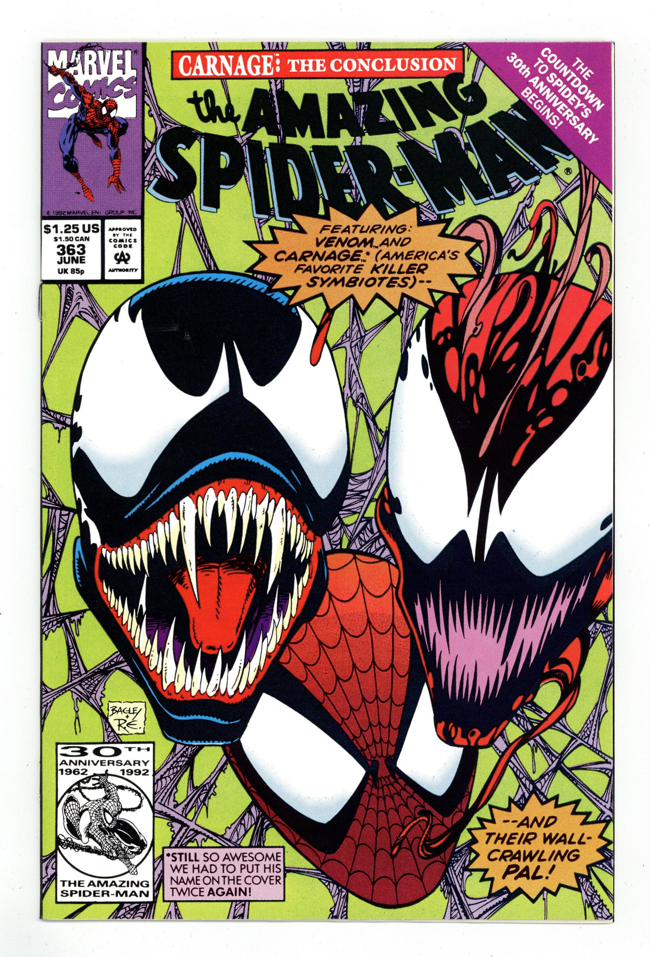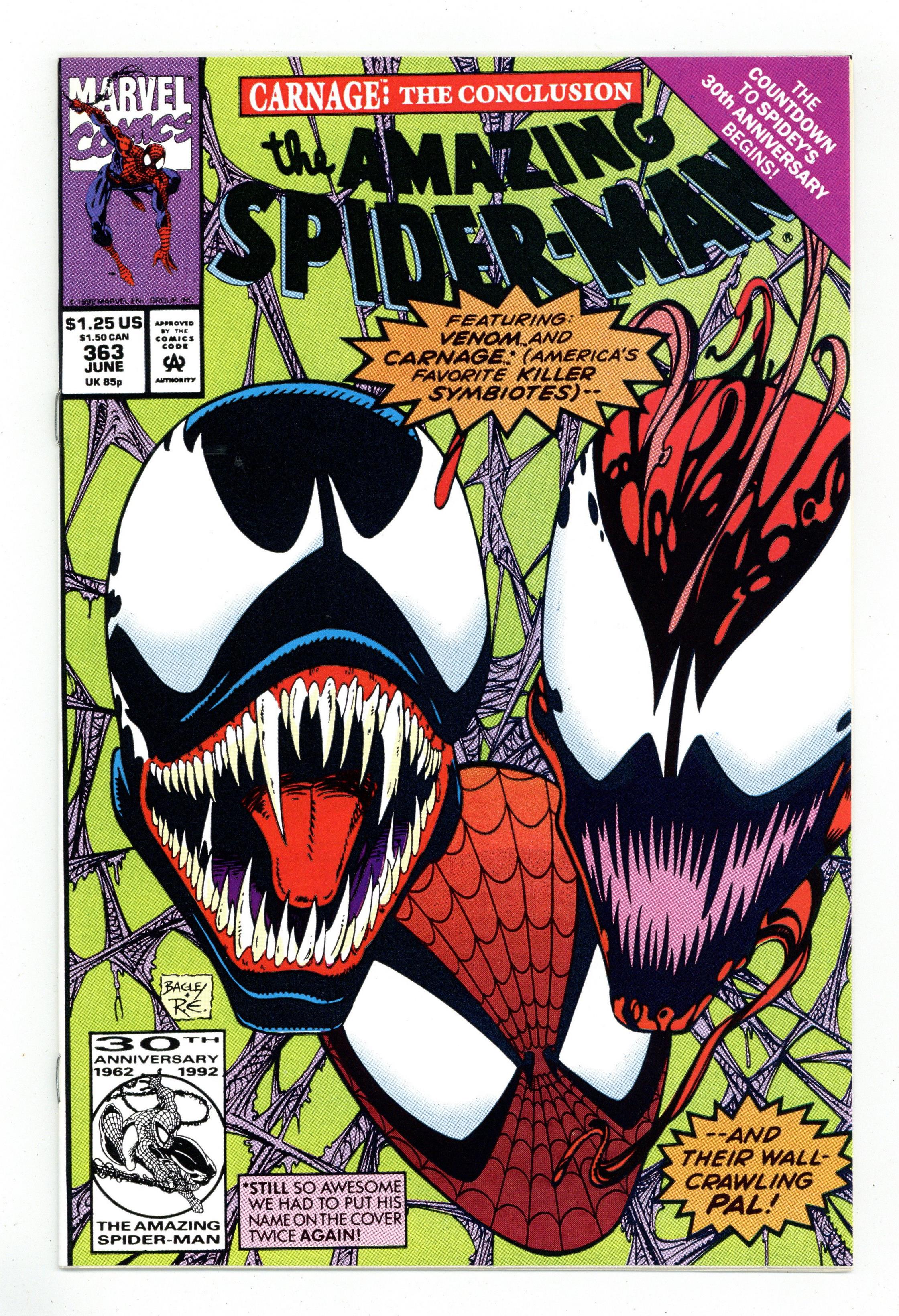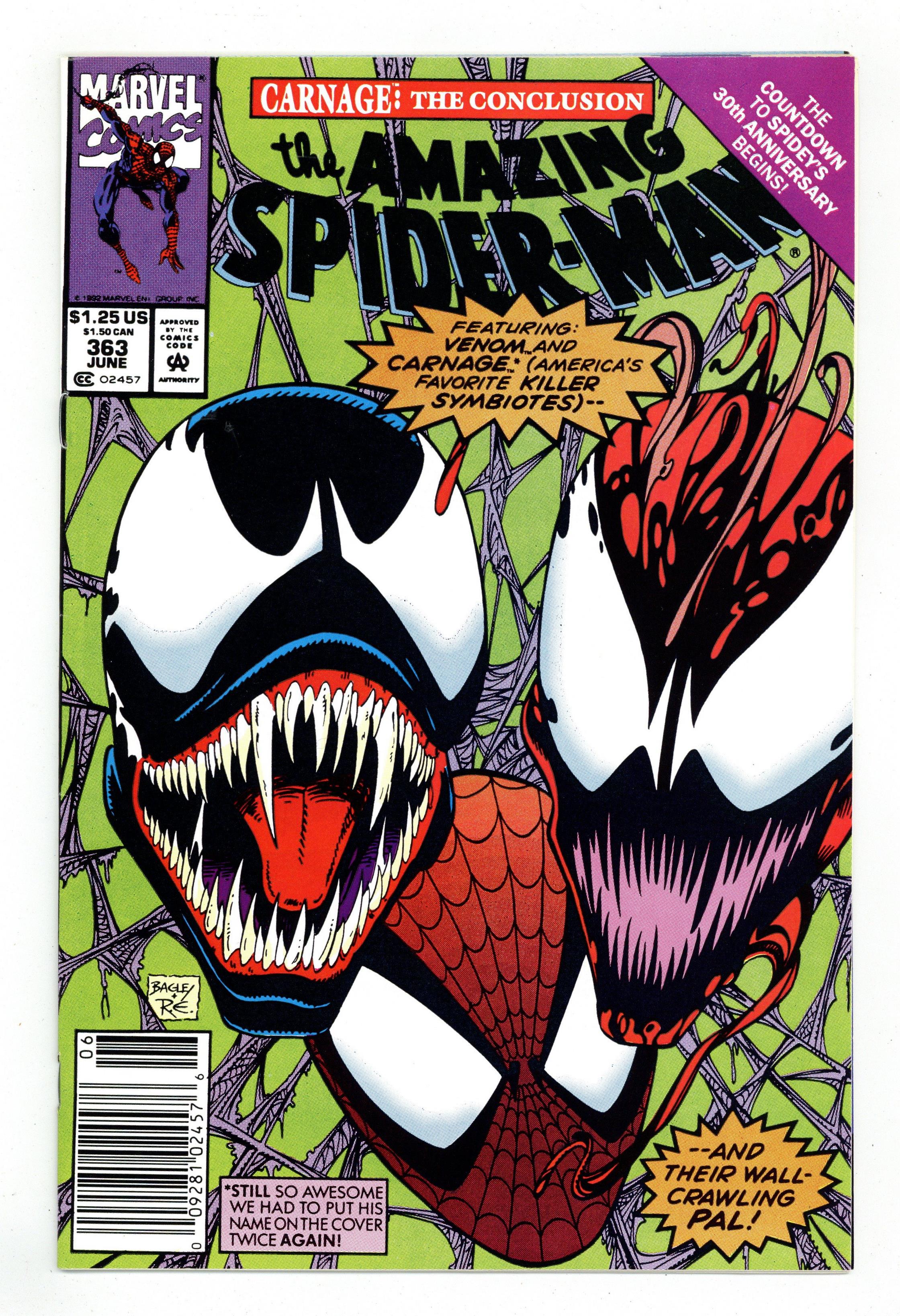 Tags: Marvel Legacy Numbering: Amazing Spider-Man (part 363), Spider-Man$11.50Direct Edition. "Savage Grace!" Part 3 of 3. Script by David Michelinie. Pencils by Mark Bagley. Inks by Randy Emberlin. Cover by Mark Bagley and Randy Emberlin. Carnage takes J. Jonah Jameson hostage and drags him to a heavy metal concert at Madison Square Garden! The psychotic killer plans to execute JJJ in front of thousands of headbangers! But before Carnage can deliver the deathblow, Spider-Man and Venom strike! The ferocious fight leads into the subway tunnels and then back onto the concert stage! Where thanks to MSG's awesome sound system, the web-slinger tries to knock out both Carnage and Venom! The wall-crawler's ploy better work, because double-crossing Venom could have lethal consequences! A fantastic finish! First appearances of the Richard Parker and Mary Parker life model decoys (LMD's). Cameo appearances by Joe Robertson, Mr. Fantastic, and the Human Torch. (Notes: Venom appears next in the one-shot: Spider-Man Special Edition -- The Trial of Venom (1992). Carnage returns in the first issue of Spider-Man Unlimited (1993 1st series) to kick off the Maximum Carnage saga.) 36 pages. $1.25 cover price. Cover price $1.25.