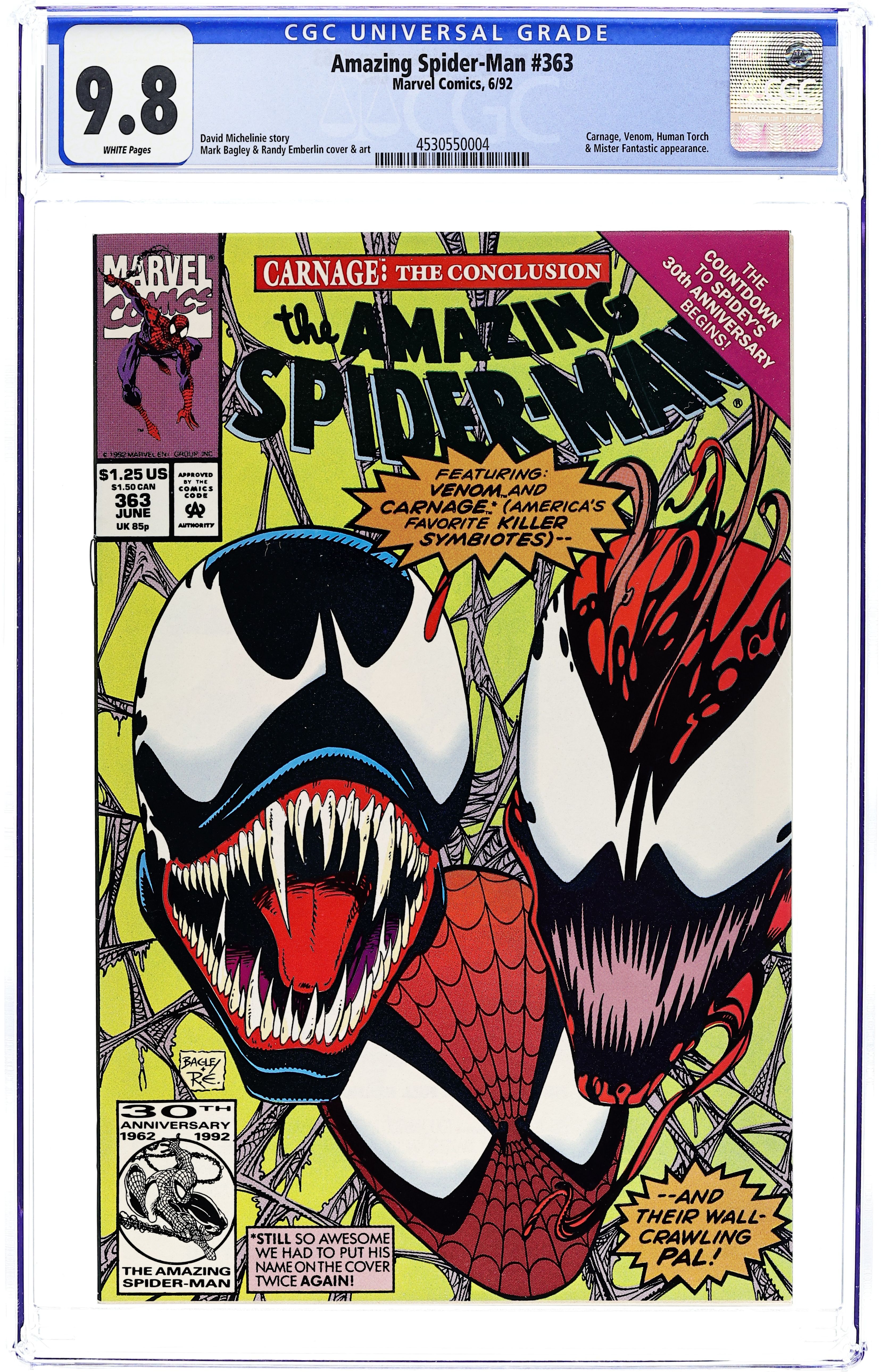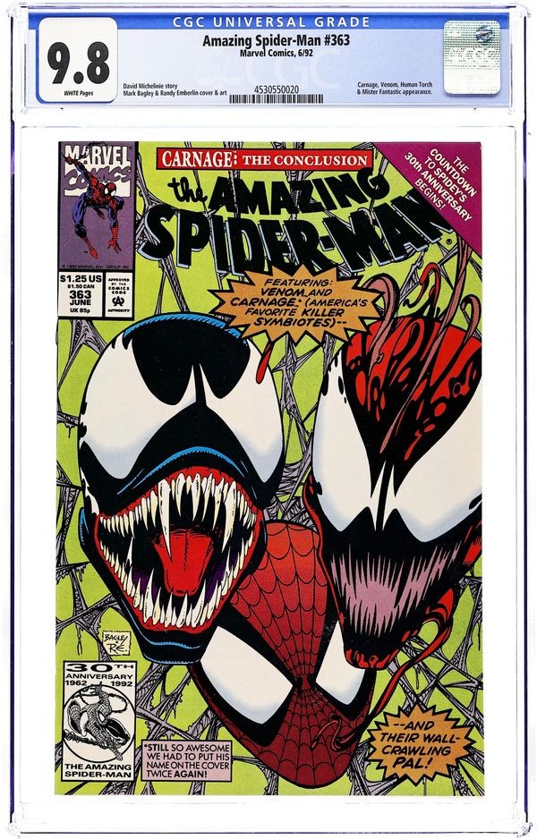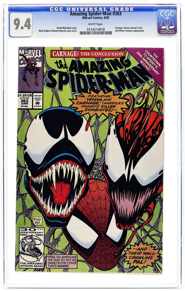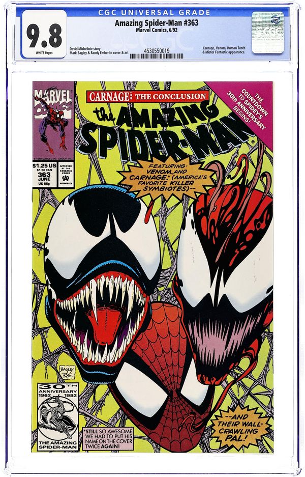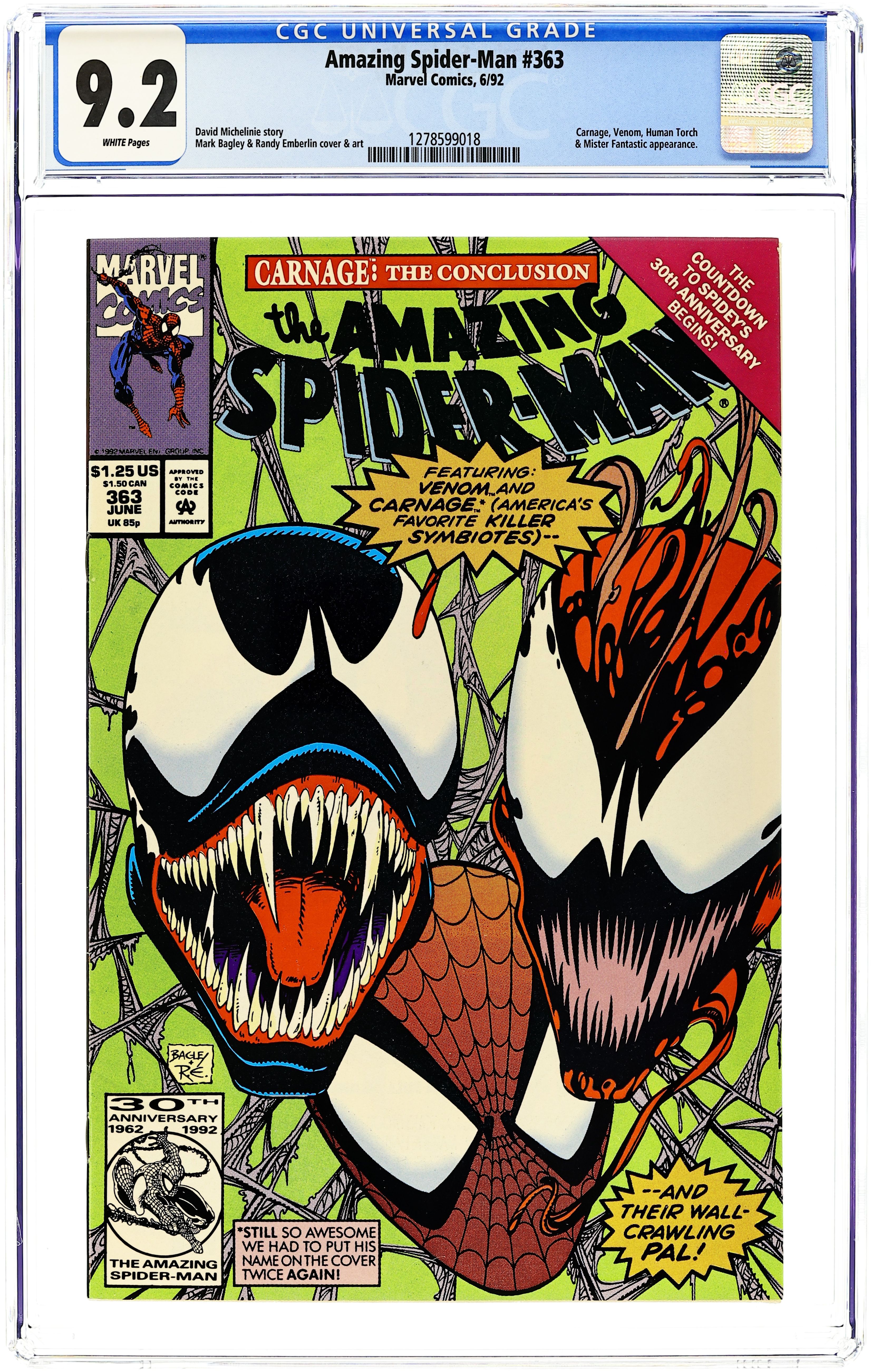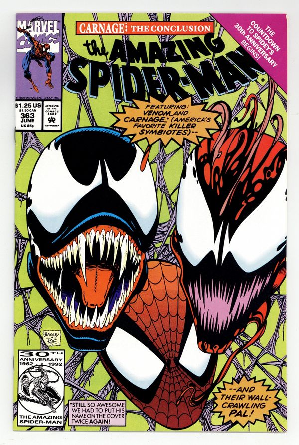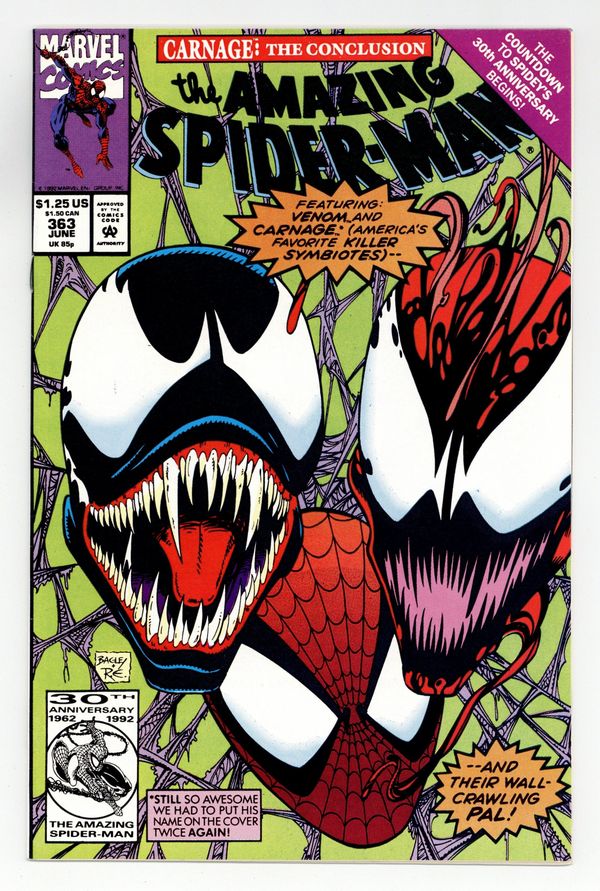 Tags: Marvel Legacy Numbering: Amazing Spider-Man (part 363), Spider-Man$11.50Direct Edition. "Savage Grace!" Part 3 of 3. Script by David Michelinie. Pencils by Mark Bagley. Inks by Randy Emberlin. Cover by Mark Bagley and Randy Emberlin. Carnage takes J. Jonah Jameson hostage and drags him to a heavy metal concert at Madison Square Garden! The psychotic killer plans to execute JJJ in front of thousands of headbangers! But before Carnage can deliver the deathblow, Spider-Man and Venom strike! The ferocious fight leads into the subway tunnels and then back onto the concert stage! Where thanks to MSG's awesome sound system, the web-slinger tries to knock out both Carnage and Venom! The wall-crawler's ploy better work, because double-crossing Venom could have lethal consequences! A fantastic finish! First appearances of the Richard Parker and Mary Parker life model decoys (LMD's). Cameo appearances by Joe Robertson, Mr. Fantastic, and the Human Torch. (Notes: Venom appears next in the one-shot: Spider-Man Special Edition -- The Trial of Venom (1992). Carnage returns in the first issue of Spider-Man Unlimited (1993 1st series) to kick off the Maximum Carnage saga.) 36 pages. $1.25 cover price. Cover price $1.25.