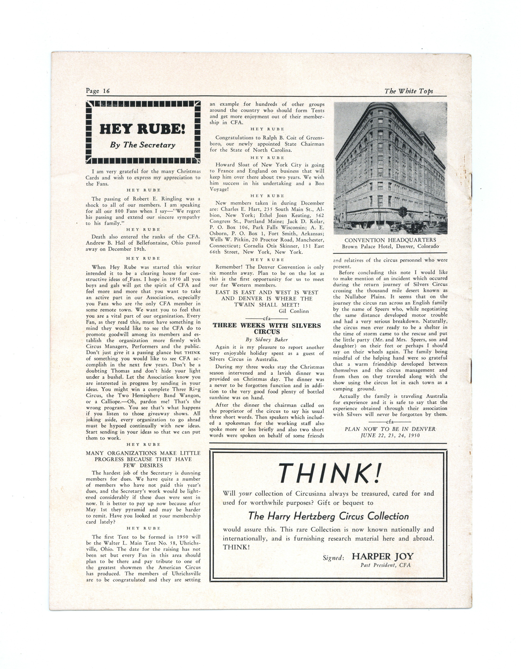 Vol. 23, No. 1/2 - January/February 1950. "White Tops" is the official magazine of the CFA and keeps the circus industry connected with news, articles and history and is sent to members four times per year. 8" x 10.5", 16 pages, B&W. Cover price $0.35.